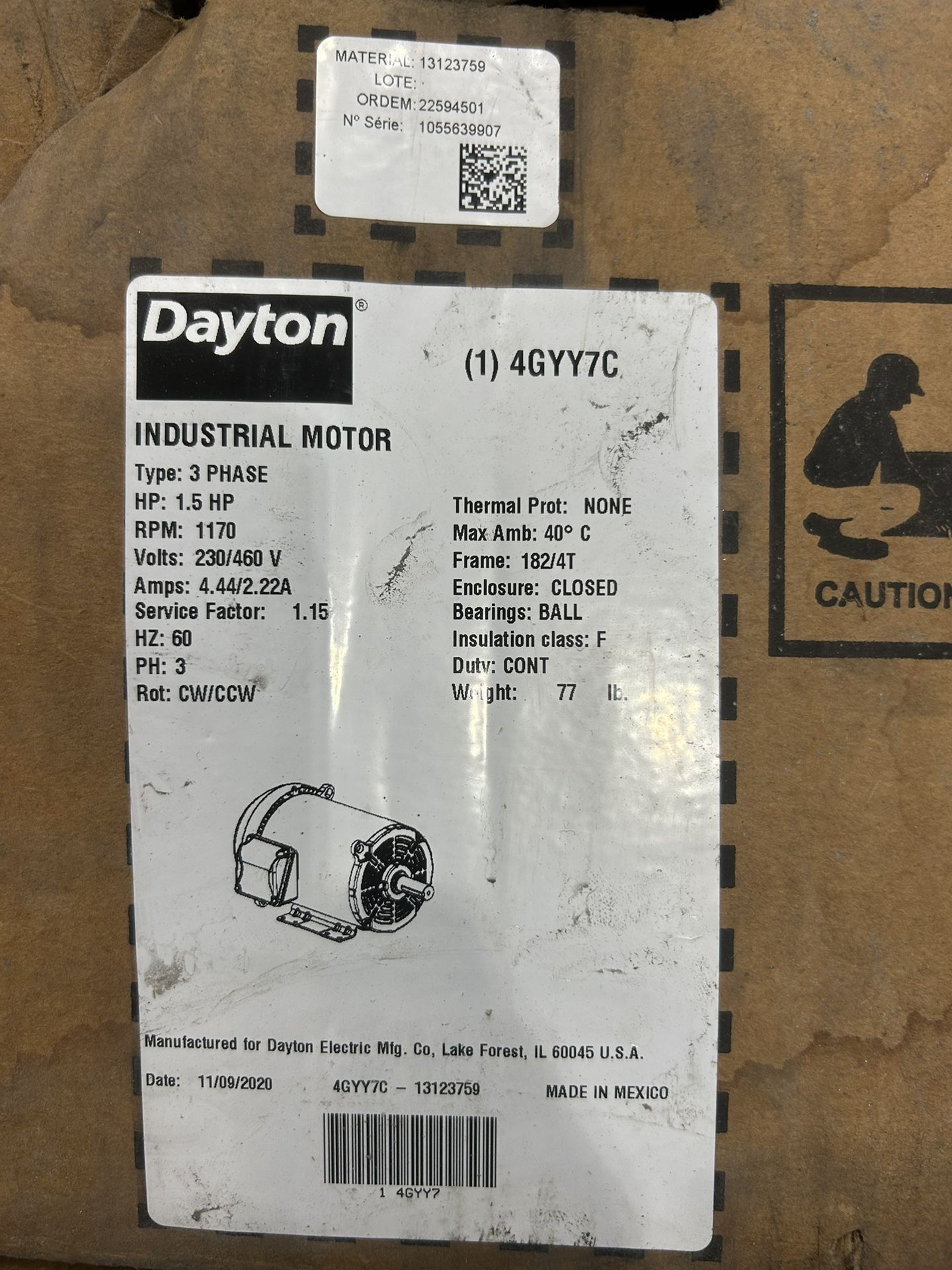 New never used. I have 2 available.General Purpose Motor, Three-Phase, Totally Enclosed Fan Cooled Motor Enclosure Design, 1 1/2 HP, Nameplate RPM 1170, Frame 182/4T, Voltage 230/460V AC, 60 Hz Hz, Three Phase, Full Load Amps 5.8/2.9 A, Rigid Base Motor Mounting Type, Motor Thermal Protection None, Ins. Class F, Motor Service Factor 1.15, Ball Motor Bearings, Motor Frame Material Steel, Max. Ambient Temp. 40 Degrees C, CW/CCW Motor Shaft Rotation, Nominal Efficiency 87.5 Percent, Continuous Duty, 1,101-1,200, CE, CSA, UL