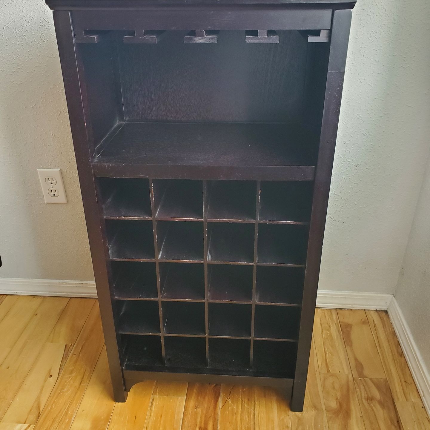 Finished in a rich, deep espresso/dark mahogany tone, it holds 12 standard wine bottles. Open middle shelf holds up to 12 large stemmed wine glasses. Vintage vibe with a compact footprint – stands about counter-height, but doesn't take up much floor space. Perfect for kitchen, dining room, living room corner, or bar area, with just enough wear to bring warmth and coziness to your space. We also take payment in US silver coins.