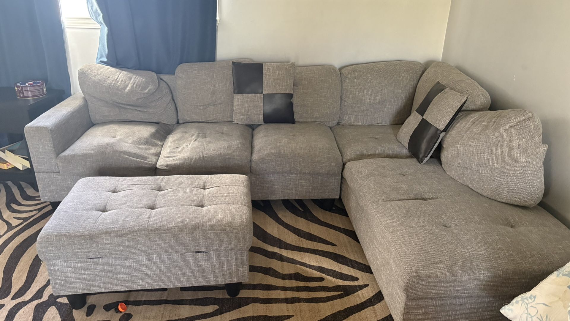 Used fairly. The spring can be felt if you sit in mid of the first and second seat. The other seats are in good condition. The ottoman has storage.