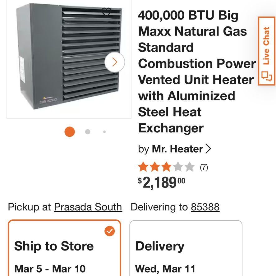 Brand new in box at a highly discounted price retail is $2189 plus tax take it today for only 1,200. Key item features Powerful Heating: Delivers a substantial 400,000 BTU heat output, capable of warming expansive areas up to 13,400 square feet. Efficient Performance: Operates with an impressive 82% thermal efficiency, ensuring effective heat generation for large spaces like factories or warehouses. Fuel Versatility: Ships configured for natural gas use, with an optional LP (liquid propane) conversion kit available for purchase separately. Adjustable Airflow: Features air louvers with three distinct locking positions, allowing for precise control over the direction of the heat distribution. Integrated Venting: Utilizes a power vent system to efficiently pump exhaust out of the building through a single vent pipe, simplifying installation. Simplified Installation: Designed for easy setup, requiring 3/8 inch - 16 tpi threaded rods (sold separately) for mounting.