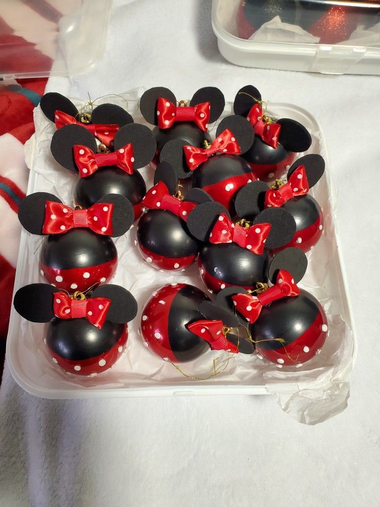 Beautiful Mickey and Minnie ornaments handmade. Each box contains 12 balls. I have 3 boxes of Minnie and 1 box of Mickey. Total 4 boxes, 48 balls. I accept offers.