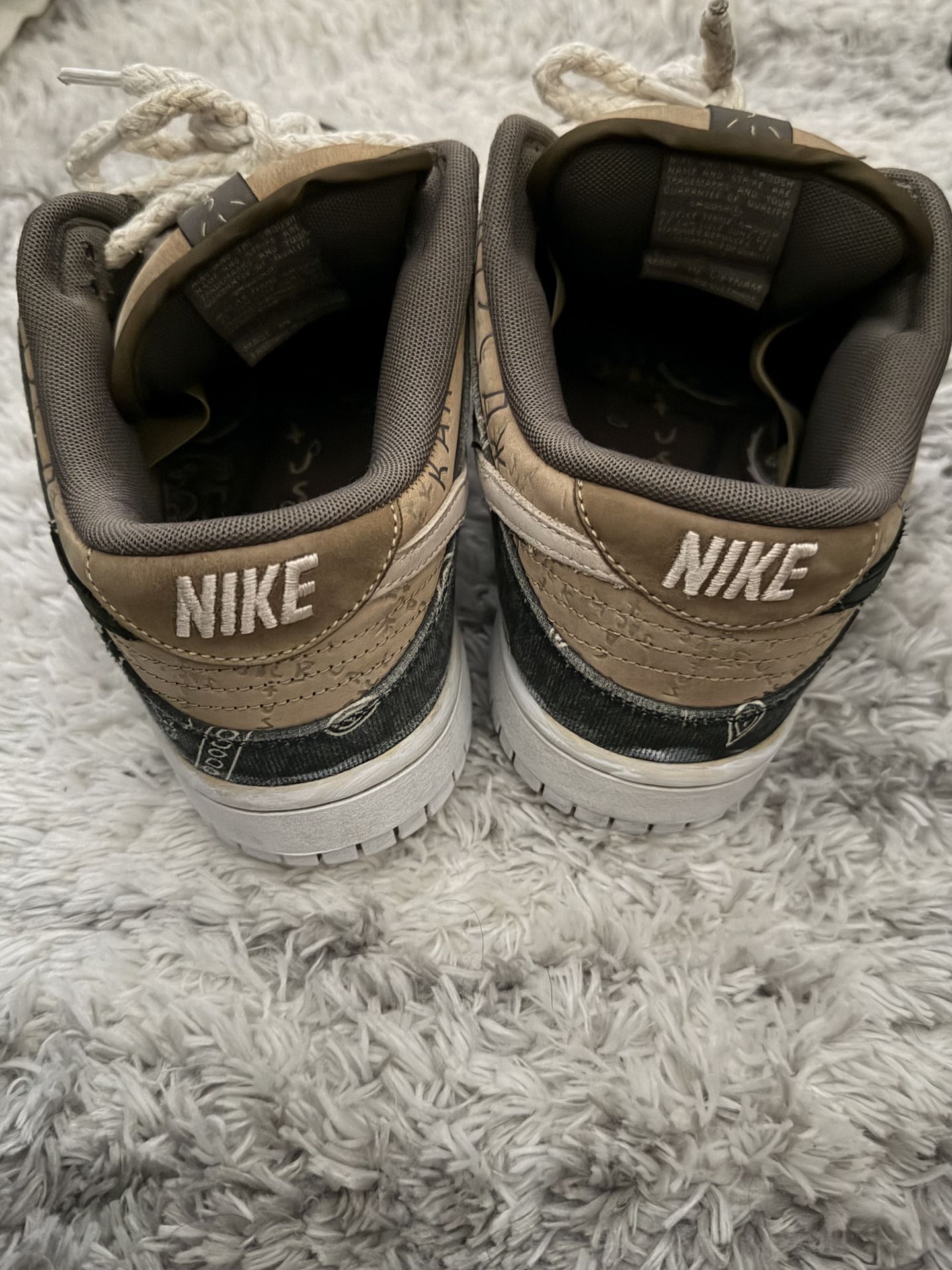 Selling my authentic Travis Scott SB Dunks. These are one of the most iconic Nike SB collaborations to date, featuring a unique patchwork design of tan suede, plaid panels, and navy paisley canvas. Key Details: • Model: CT5053-001 • Condition: Pre-owned/Good. Cleaned regularly. Some natural creasing on the toe box and minor wear on the suede (see photos). • The "Secret" Layer: The paisley canvas overlays are designed to tear away or wear down to reveal a hidden woodsy elephant/camo print underneath. • Accessories: Includes original rope laces. (Note: NO BOX included). Price: $1000 Lowball offers will be ignored. These are currently going for $1,600+ with a box on StockX/GOAT, so get a steal here because I’m missing the packaging.