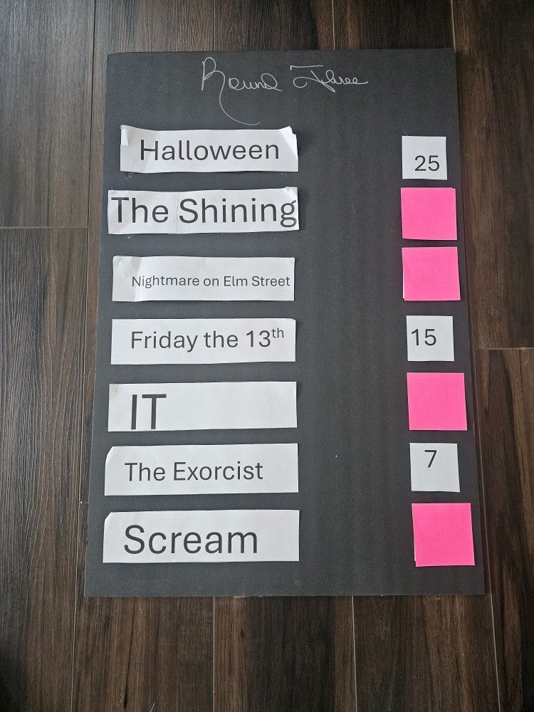 Game includes 3 large Poster Boards with 6 rounds including double and triple rounds. 6 Halloween Questions including: Top Halloween Costumes Songs, Movies, etc All you will need is 2 buzzers at dollar tree and either an easel or window sill. I used a 3 way poster board ftom d DOLLAR tree with left side Team A, middle Questions poster boards and right side Family B. All points add up to $100. When team guesses answer, simply remove cover of answer and then post it note for points Great Game for your Adult Hallowern Home Party!