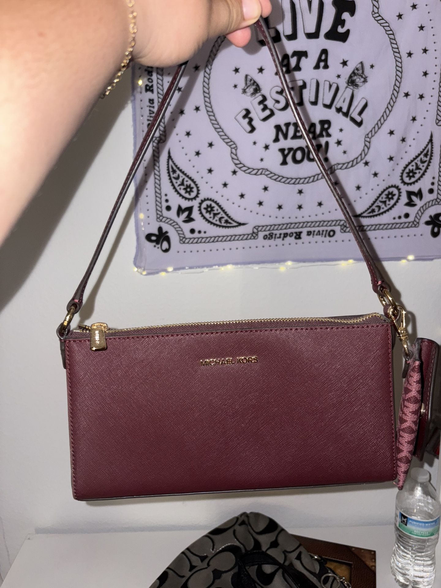 A burgundy completely new Michael Kors hand bag! I have never used it and it is in impeccable condition.