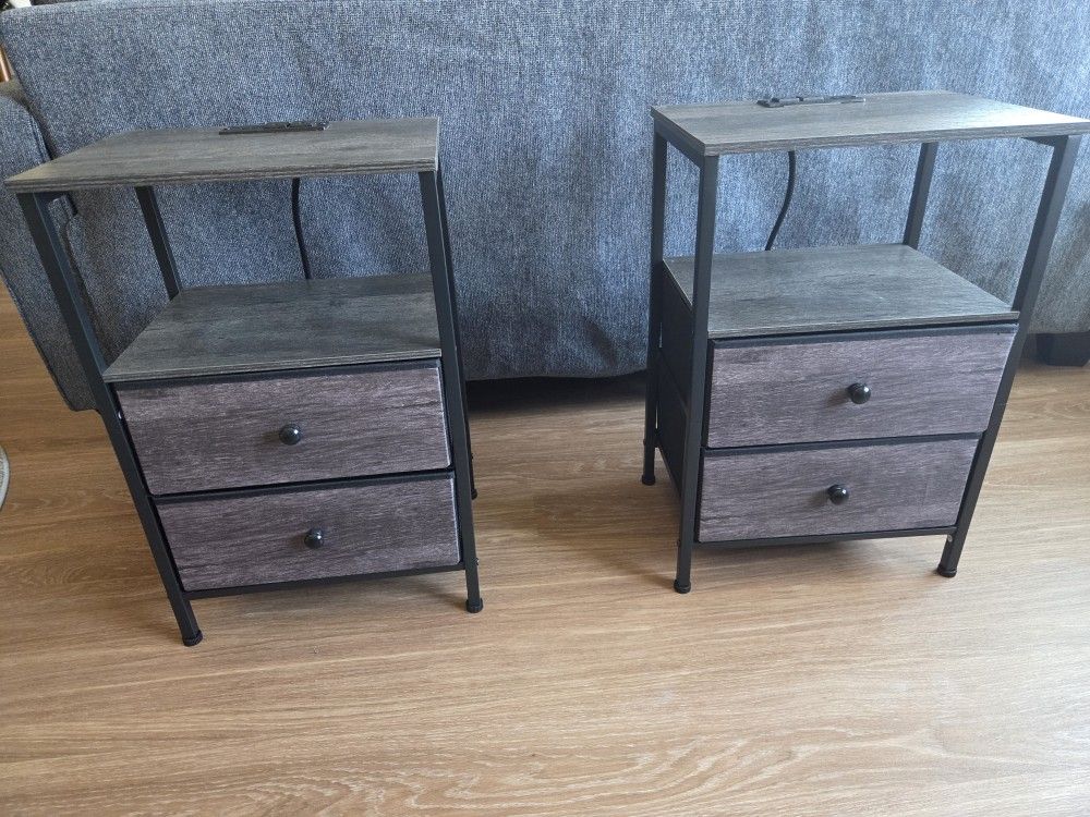 Small side tables with USB and electrical outlets on top. Drawers are fabric. Legs are metal, shelves pressboard. Includes never used/installed LED strips. Less than 6 months old. Moving for a job.