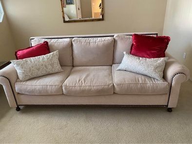 Beige/tan sofa, Length 95 Width 40 Height 36 (4 pillows not included) Very comfortable