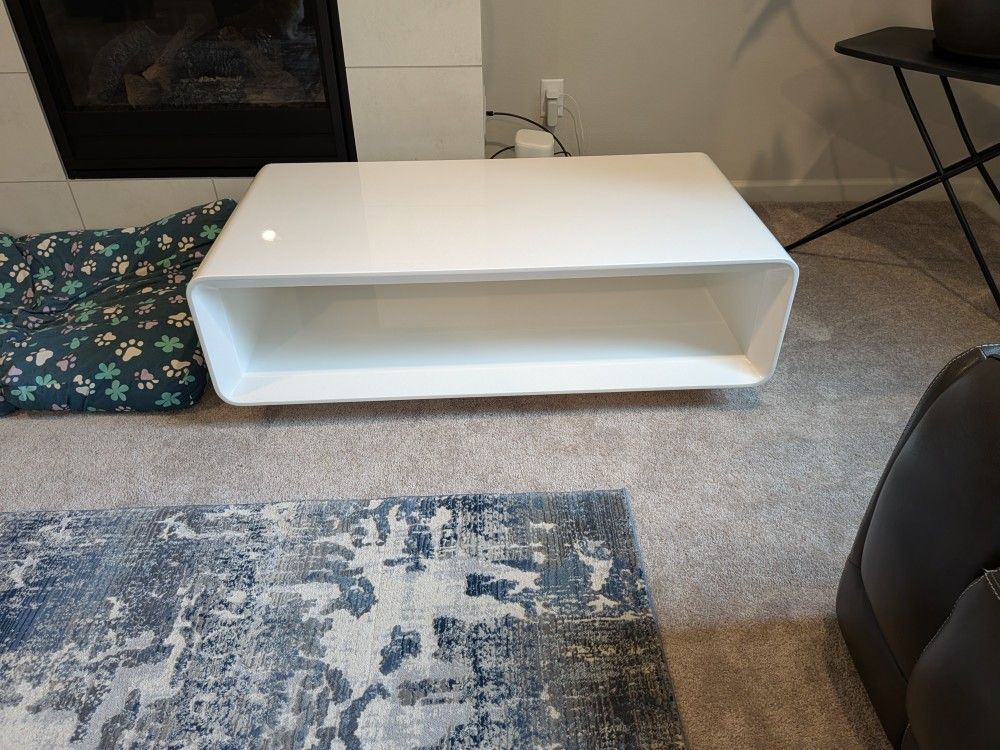 Beautiful modern high-gloss white coffee table in excellent condition. • Sleek curved-edge design • Open storage shelf underneath • Minimalist contemporary look • Sturdy and well maintained • No major scratches or damage Perfect for modern living rooms and apartments. The glossy finish reflects light and makes the space feel bright and clean. Selling due to relocation. Pickup only.