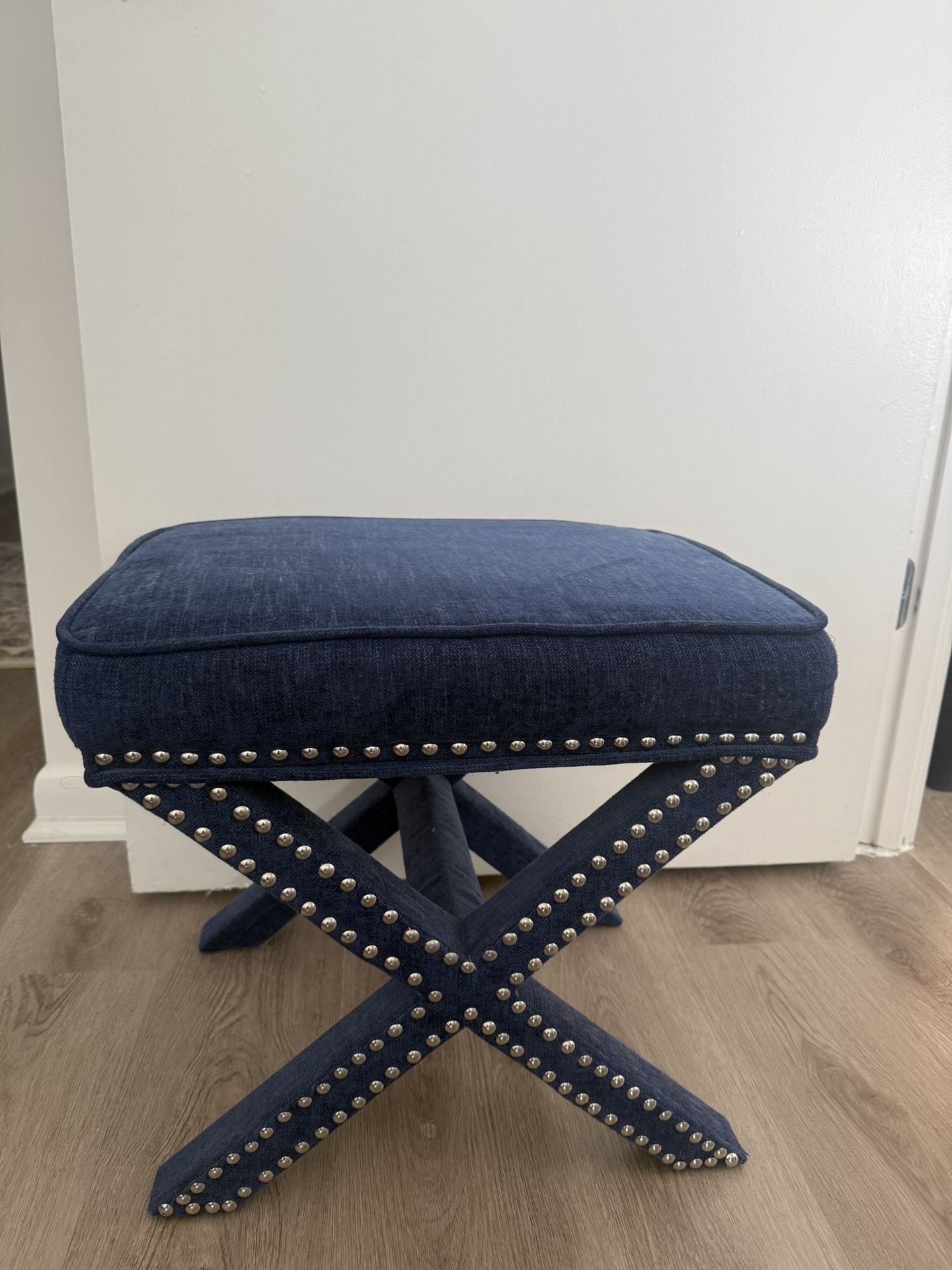 Contemporary Velvet Upholstered Ottoman / Bench with X-Leg Design, Deep Button Tufting and a Solid Wood Frame Navy