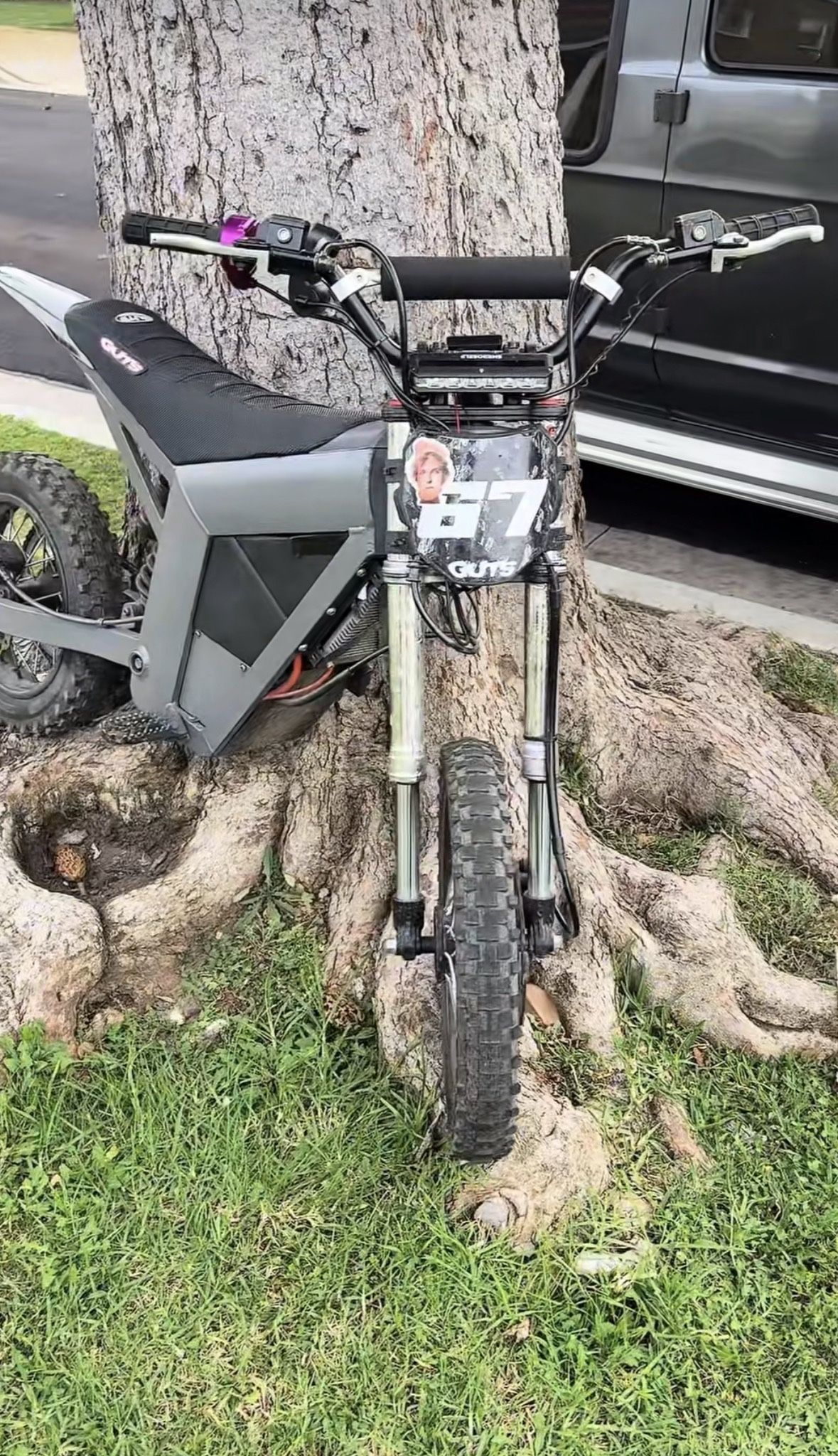 Grey Tuttio upgraded throttle kit plate back fender horn and all throw in a surron fender comes with charger upgraded bars.