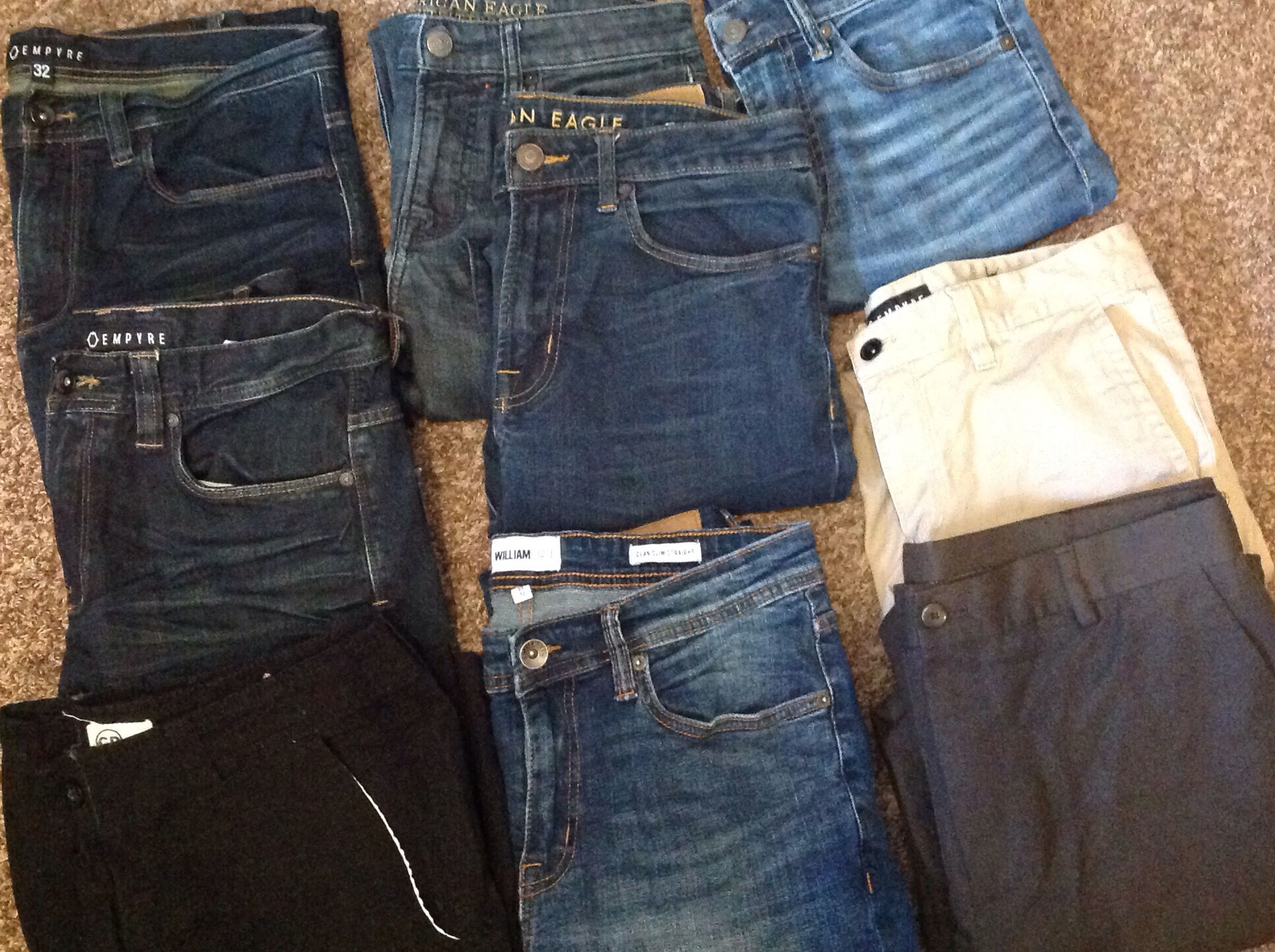 American eagle dark blue 32/32 AE 29/32 AE 28/30 Empire 32 Empire 30 Empire 30 William Rast 32/32 34/32 van Huesen CD 32 (shorts) All gently used before this kids sudden growth spurt. Trades always considered