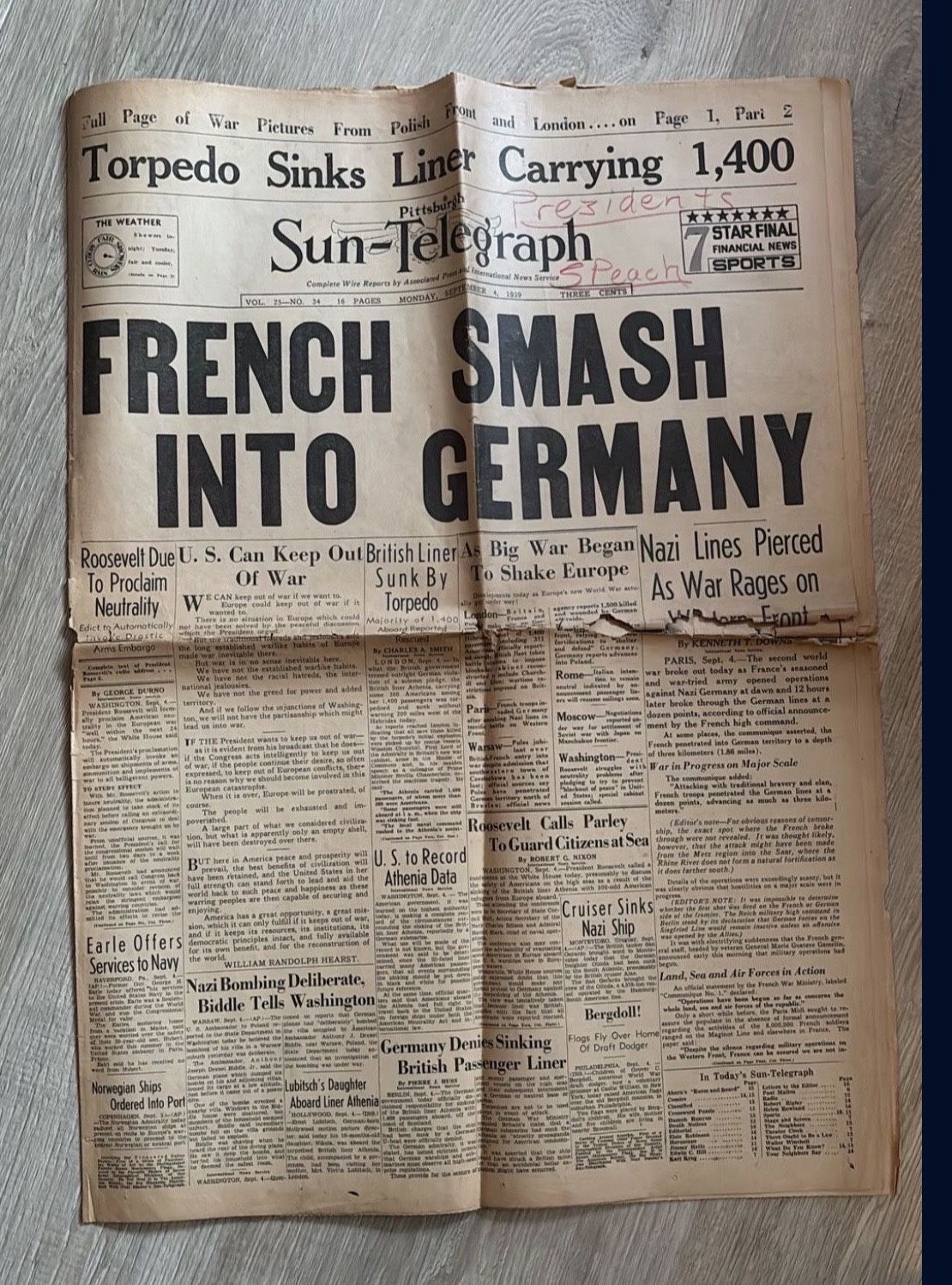 Original WWII era bundle from a Pittsburgh family collection. Includes two authentic wartime pieces: • Pittsburgh Sun Telegraph newspaper with bold front page headline “French Smash Into Germany.” Original WWII era front page covering major early European war events. Shows normal aging for its age including fold lines, toning, and edge wear. • “Yank Talk” A.E.F. humor booklet. Original small format wartime cartoon and humor booklet circulated among U.S. soldiers during WWII. Complete with cover and interior pages. Mild age wear consistent with use. Both items are genuine 1940s wartime paper ephemera, unframed and unaltered. Ideal for collectors of WWII memorabilia, military history, vintage newspapers, or framing for display. Condition Used, normal age related wear. See photos for detail. Pickup and payment Local pickup. Cash preferred. No trades.