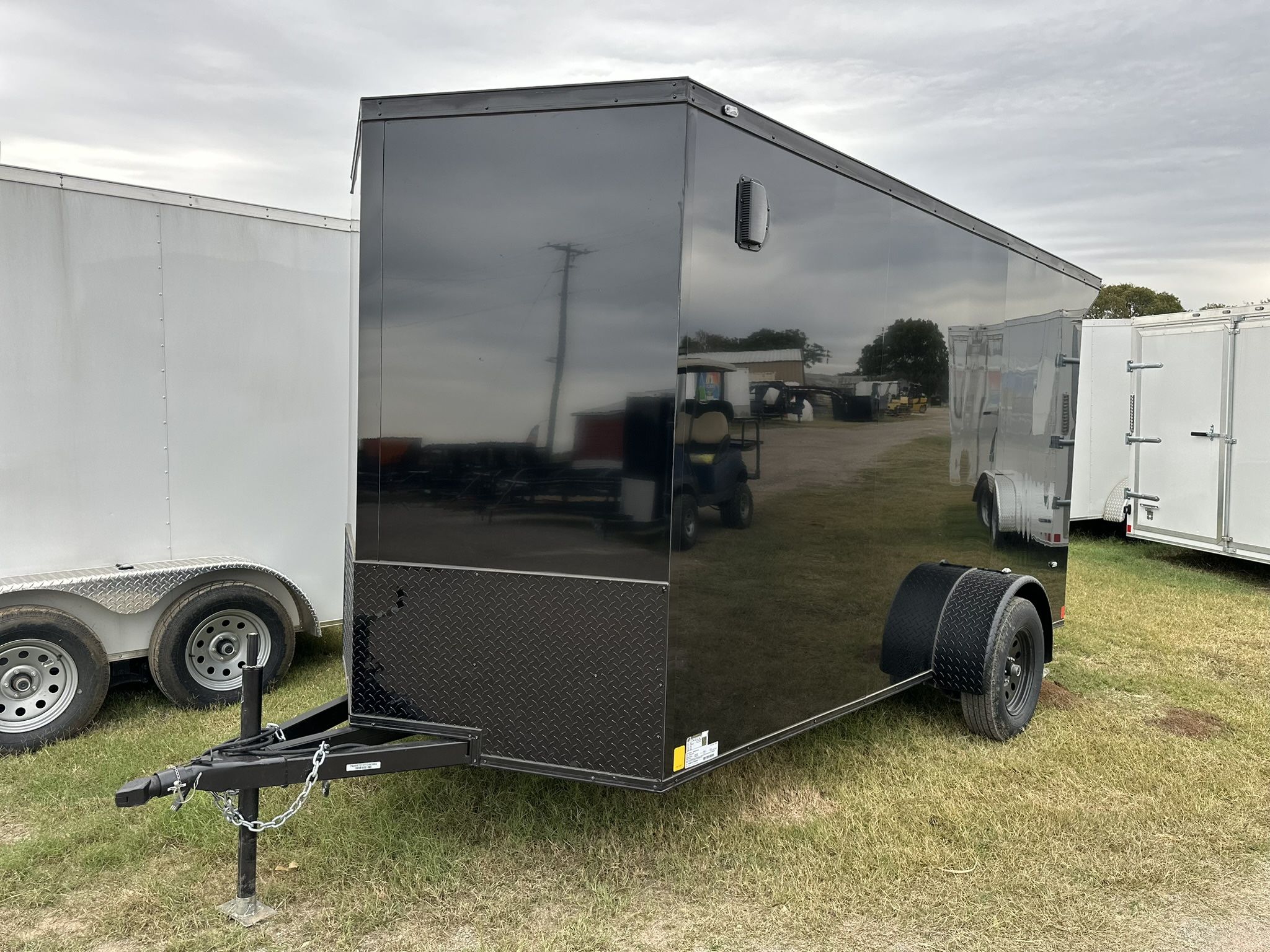 6x12 SA blackout enclosed trailer 2026 Model V Nose RV Latch Polycore 6.6ft Interior Height 3500 Axle Ramp Door with Spring Side Access Door 2 Hitch Ball 3/8" Walls 3/4" Floors LED Tailights Safety Chains
