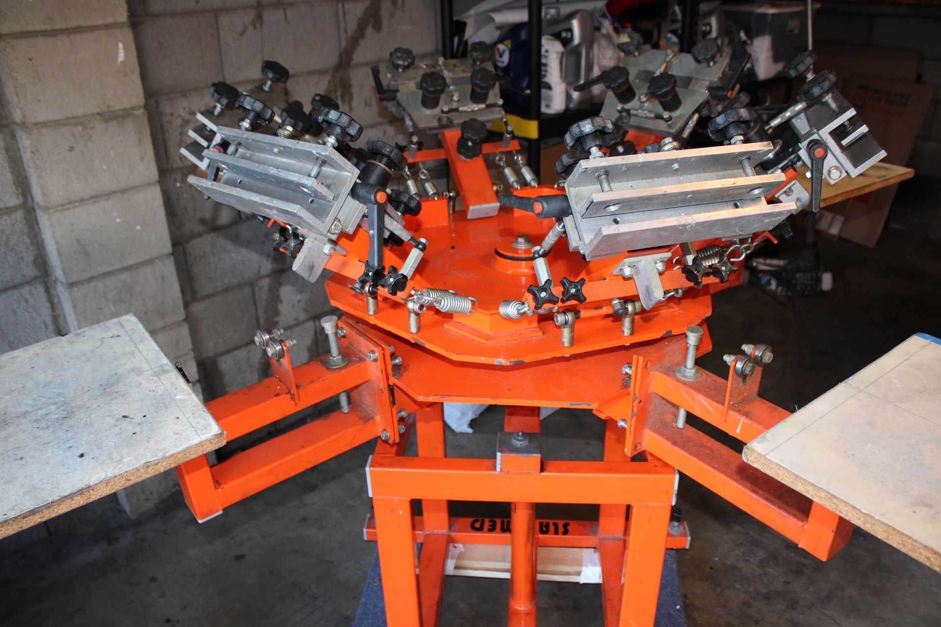 CAPS 6 color 4 station screen printing press I’m selling this press because I’m moving on from Screenprining. It’s a quality presss that will help you take your business to the next level. Comes with 2 large frames. I believe they are 20x24 in. Also comes with this bbc black body semi industrial flash dryer. (Main unit has to be re-bolted on with some screws. Old ones got rusty and wouldn’t hold the main heating unit to the frame. Also comes with a large high quality platen as well. Now, of the plastic handles on the platens have cracked . They can be replaced. Can be seen in the picture. When it comes to the registration , only one of them is half cracked. Seen in the pictures. The station arms have three missing bolts . Can be used without them though. I use the press this way without a problem. Can be replaced with some from Home Depot. This is the perfect press for someone who wants to get started without investing into a $2000+ screen printing press. Really heavy as well, so you will need a truck and a couple of hands to help with loading onto truck. Disassembled to make transporting much more easy. I’m here to answer your questions.