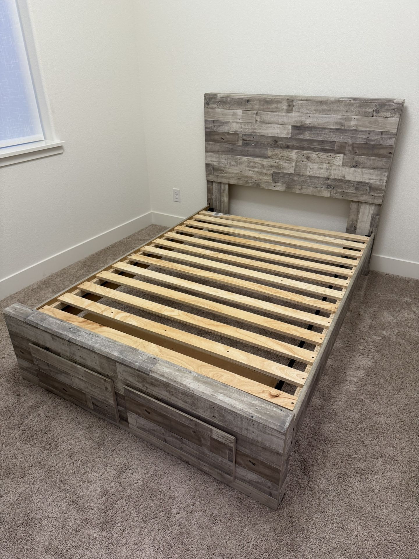 Bed is used sparingly and is in new condition, very sturdy, box spring not required, matching night stand sold separately for $75