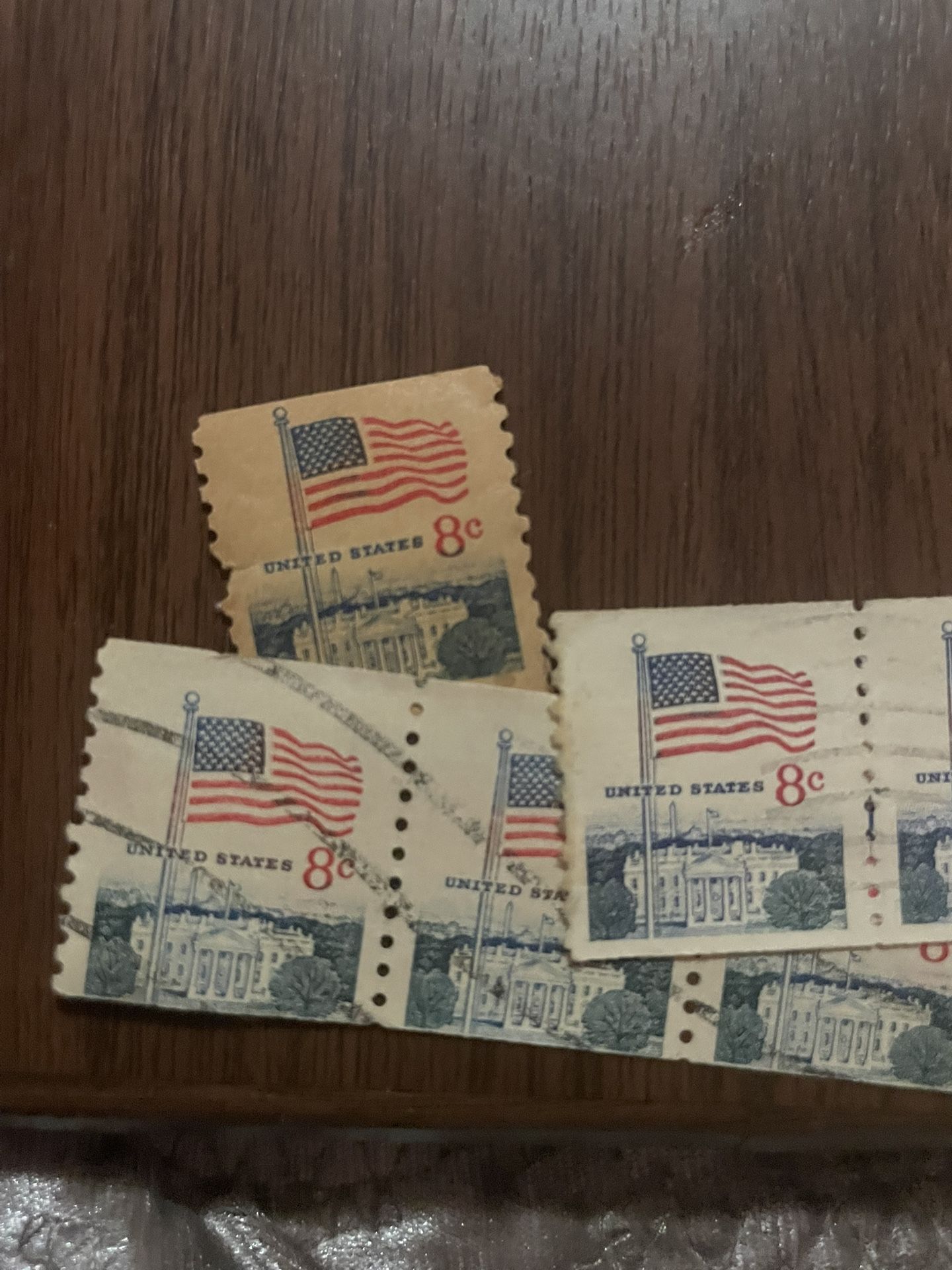 The stamp features the American flag flying above the White House. It was issued in 1968. The stamp has a face value of 8 cents. 7 available