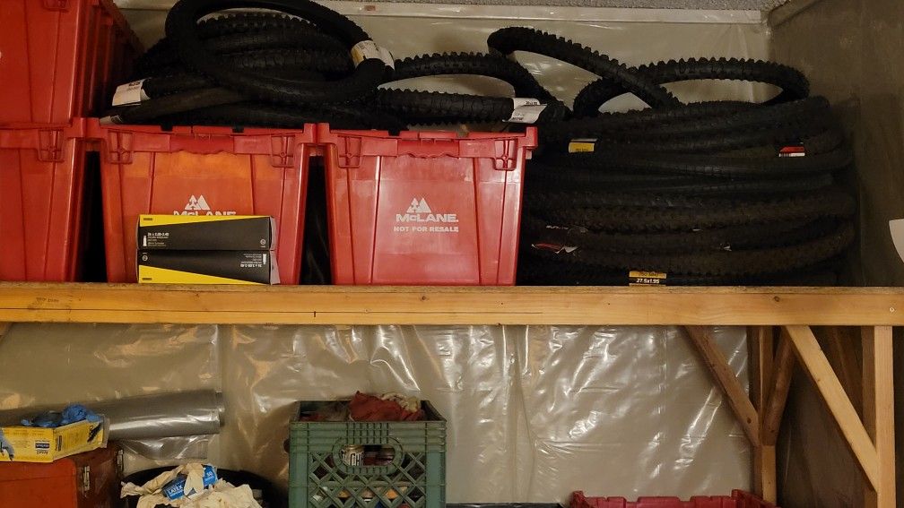 Have new bicycle tires and tubes plus other items, price is for it all you will need your own containers All items are new MAKE OFFER for it all or tell me what you need and I will give you price