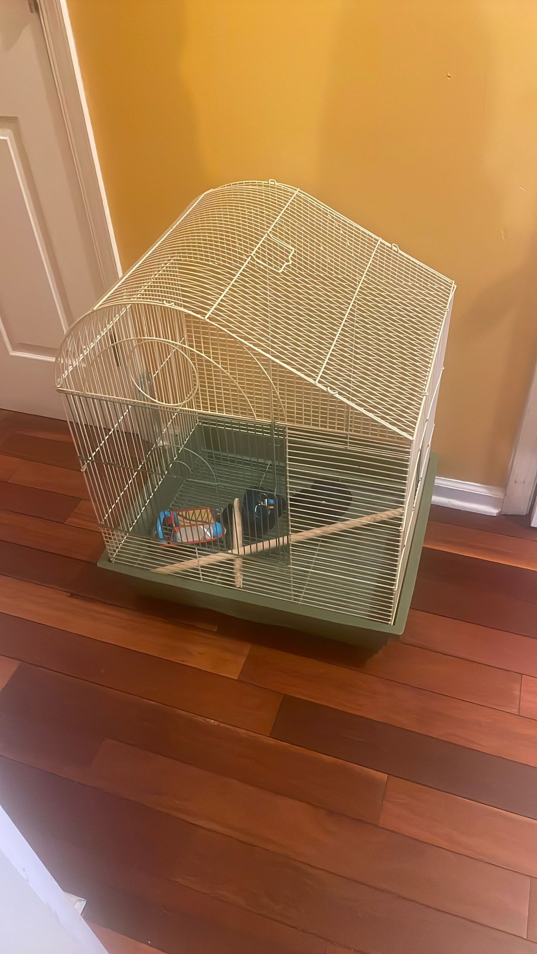 i hade 4 cakatoo in it but i needed to separe it so i buy two of the same and now i don’t going to use it but is perfect for 4 or 5 birds, is berry clean and it come with some toys and water and food serving