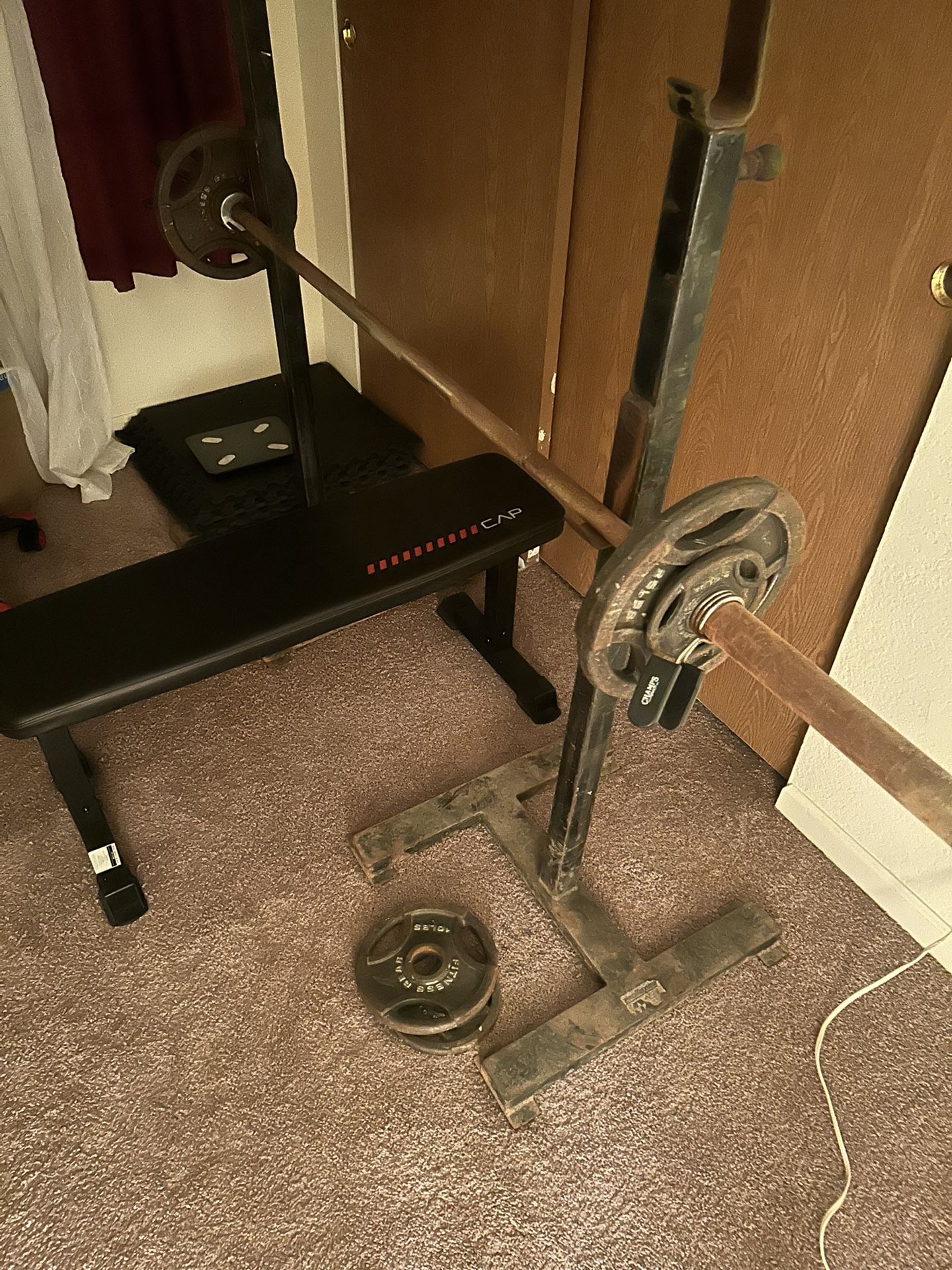 Weight bench with barbell. Barbell is 45lbs, and x2 25lb plate, x2 10lb plate, x2 5lb plate, and x2 2.5lb plate. Bench included as well as floor pads. $125 obo. It’s rusty but still sturdy.