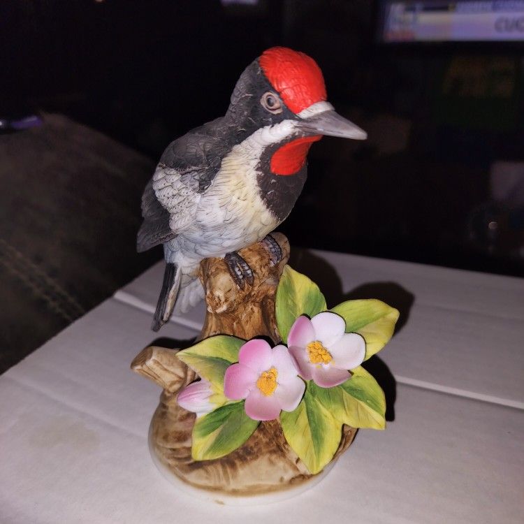 This is a vintage Downy Woodpecker porcelain figurine by Andrea by Sadek. The figurine is hand-painted and depicts a Downy Woodpecker on a branch with pink and white flowers. These figurines were made in Japan and are often identified by a number, such as #9386.