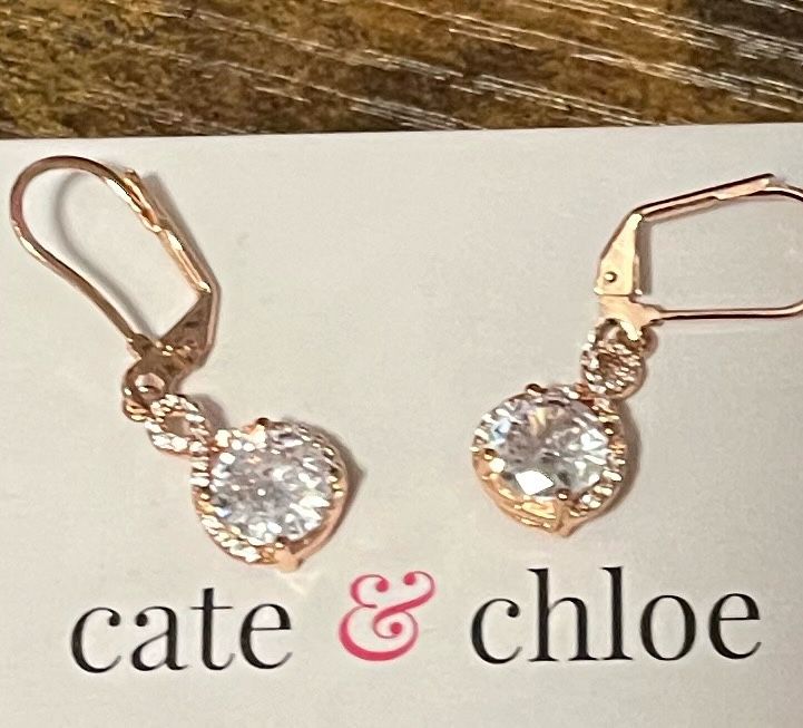 These are beautiful, brand-new Cate & Chloe earrings that add instant sparkle to any look! Style: Elegant Drop/Dangle Key Features: Rose Gold Tone: A popular and warm metal tone. Halo Solitaire Design: Features a brilliant, round-cut Cubic Zirconia (CZ) stone surrounded by a sparkling halo—giving a luxurious, high-end diamond look. Secure Closure: Equipped with comfortable and highly secure lever-back findings (no lost earrings!). They are versatile for daily wear or special events (weddings, parties, holiday gifts). Comes with the original Cate & Chloe box for perfect presentation. Make An Offer!! Every Purchase Made Goes For My Relocation Plan To Florida - Thank You For Your Support