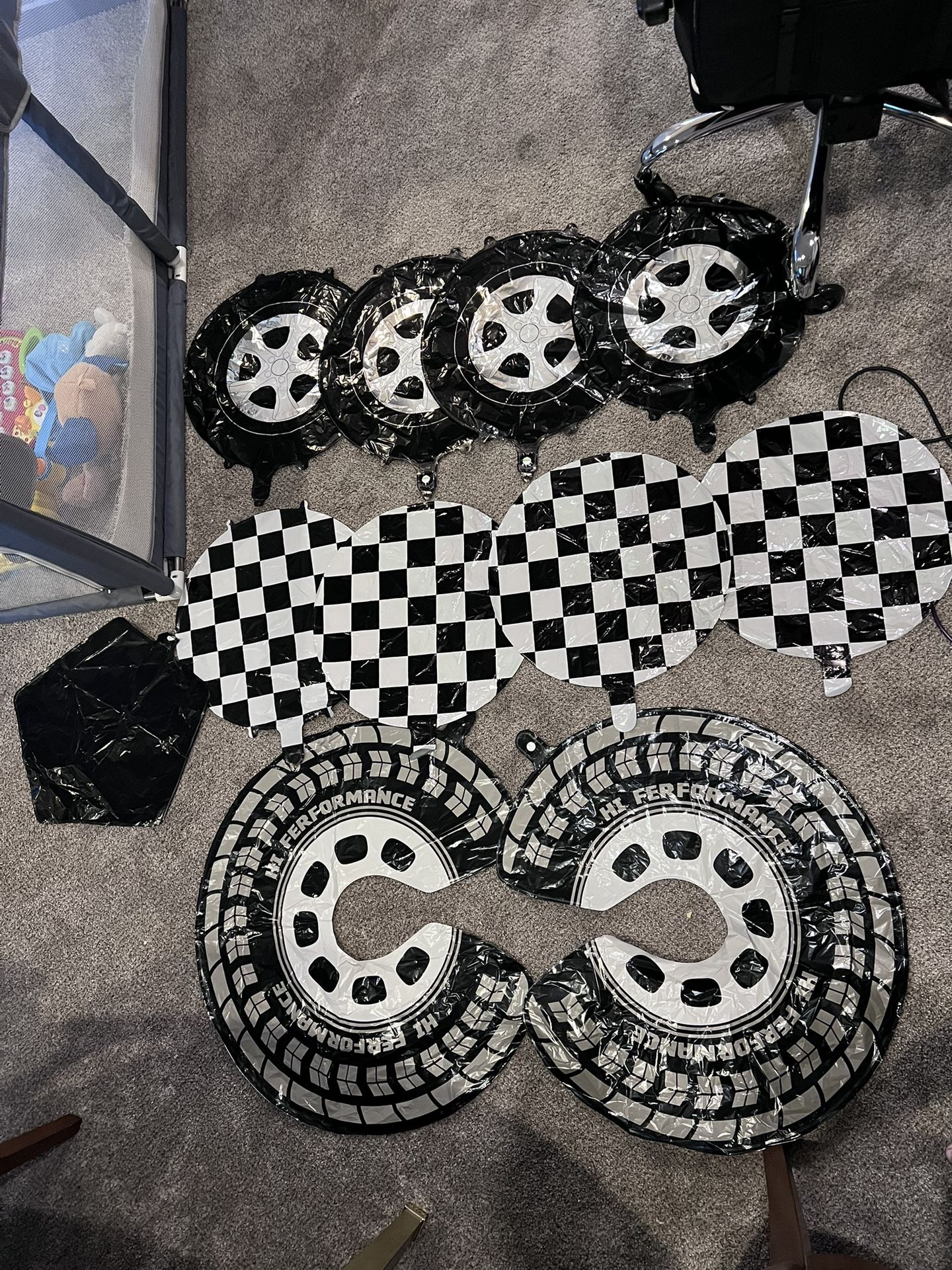 2 bigger wheel balloons 4 smaller wheel balloons 4 checkered balloons 1 star balloon 1 number 1 balloon 1 happy birthday truck balloon 1 cake smash outfit 1 high chair “one” banner 1 happy birthday cake topper 20 obo