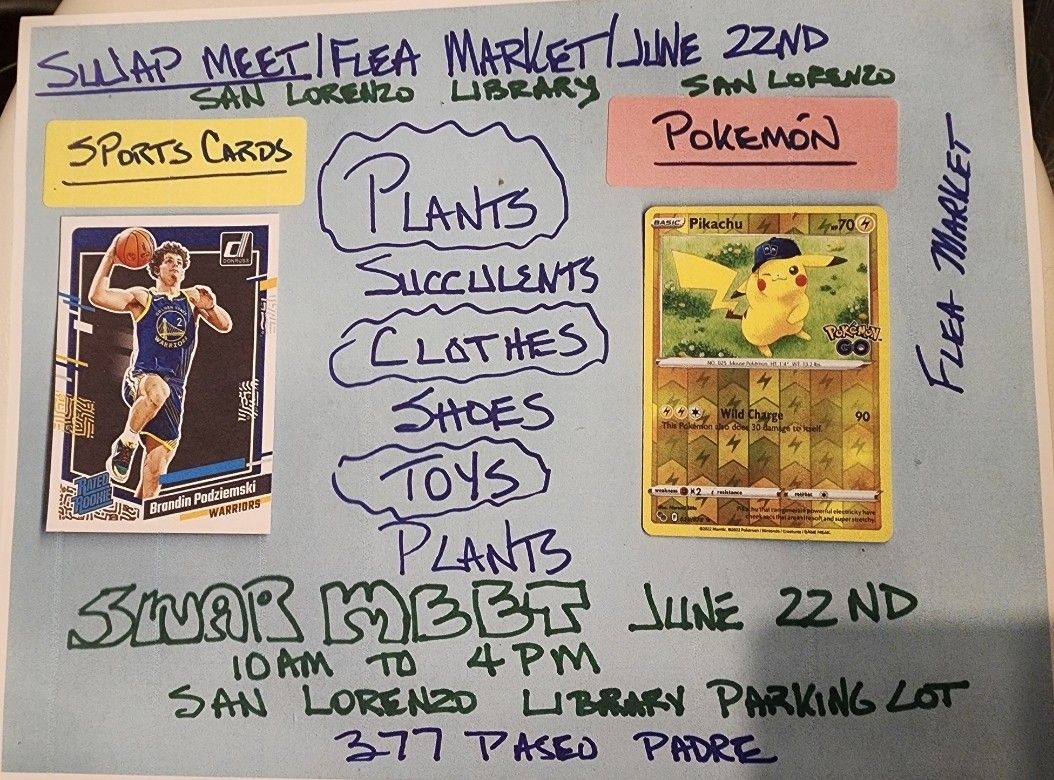 EVERYTHING UNDER THE SUN STARTS AT 10AM... SAN LORENZO LIBRARY PARKING LOT.. 377 PASEO PADRE BY THE FIRE STATION I WILL HAVE TONS OF PLANTS AND SUCCULENTS.. 3 FOR $10.. LITHOPS. PINK WITCH. ANEONIUMS ARRANGEMENTS AS LOW AS $5.. ALSO WILL HAVE SPORTS CARDS.. RAIDERS. MAXX CROSBY. OCCONNEL D ADAMS 49ERS. PURDY. AIYUK. MCCAFFEY BOSA. MONTANA HUGE MYSTERY BOXES FOR $15 MYSTERY GRAB GRAB BAGS FOR $2 CLOTHES. SHOES. BABY STUFF TOO