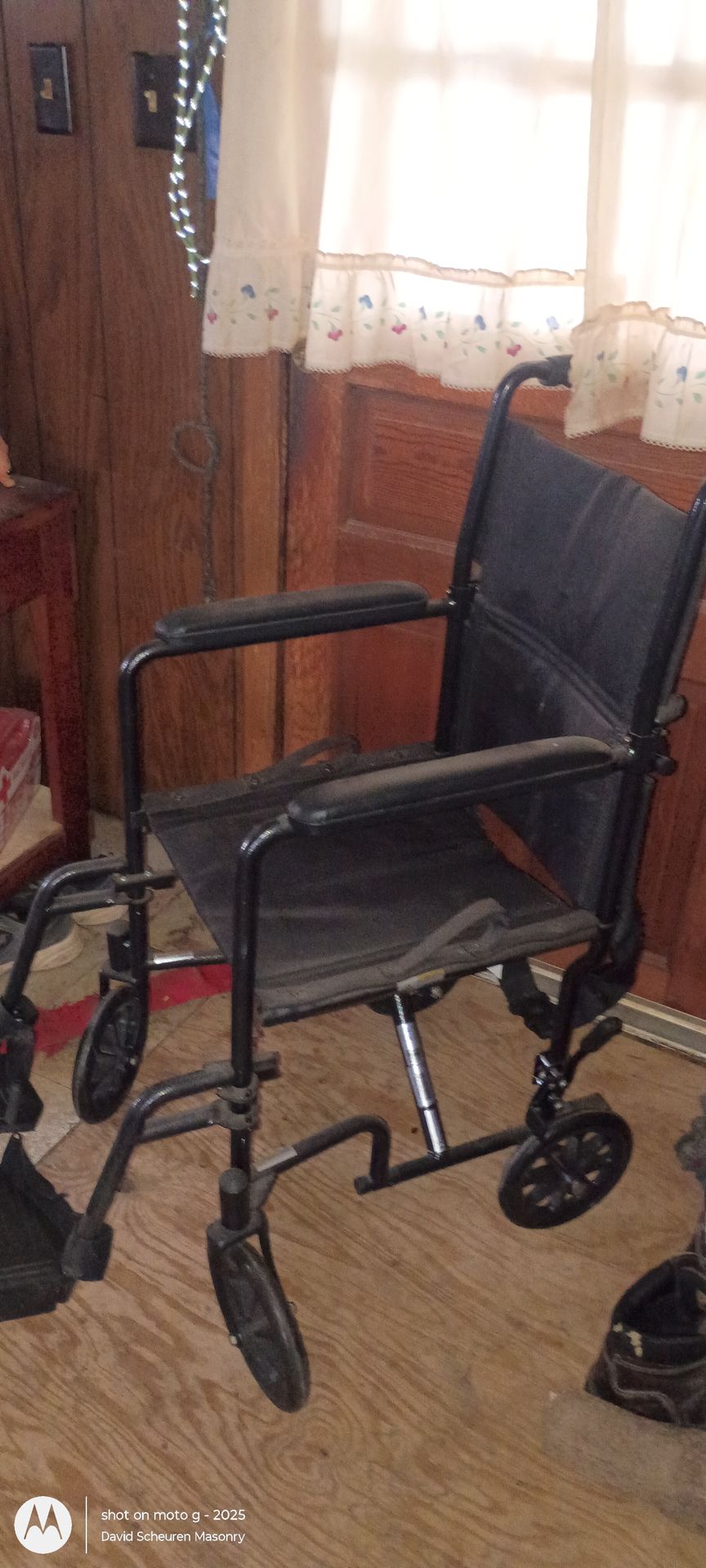 Folding wheelchair with brakes. Missing plastic clip. Can easily obtain from company. Black in color. Manufactured by Drive.