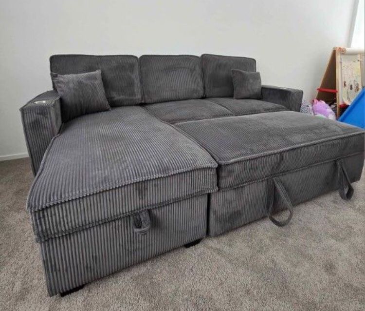 Dark Gray Corduroy Sectional Sofa Pull-out Bed & storage Chaise, Sectional Sleeper