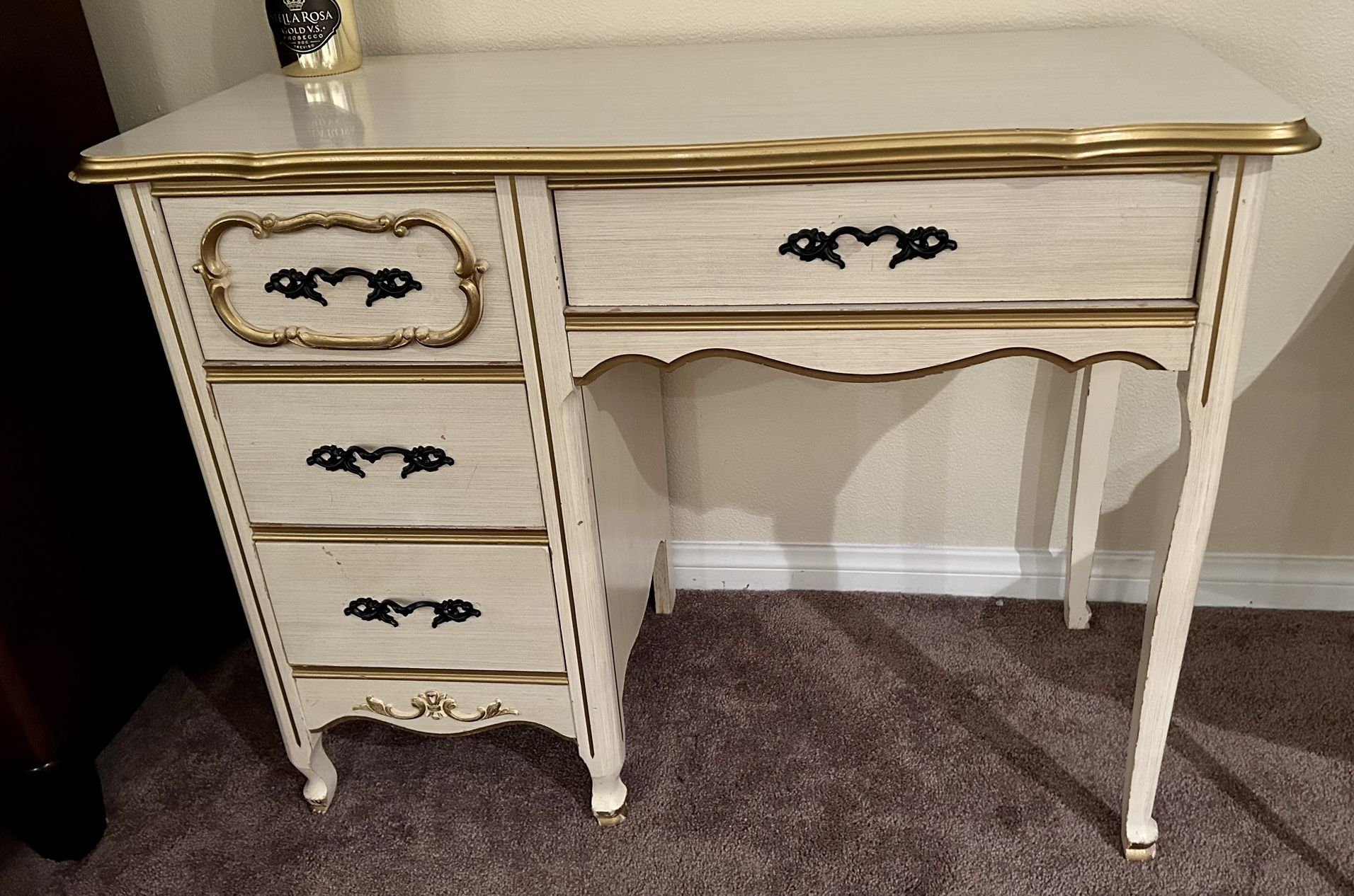 *** We recently moved and it is nowhere to be found. It’s possibly buried in our storage unit. As soon as it’s located, I will repost*** Beautiful late 1960’s early 1970’s French Provincial desk or could be used as a vanity. Minor dings but very sturdy! Original hardware painted black. (I don’t have original chair but I’ll throw in what my daughter used. I’ll upload pics asap) Pick up only Cash only Price negotiable