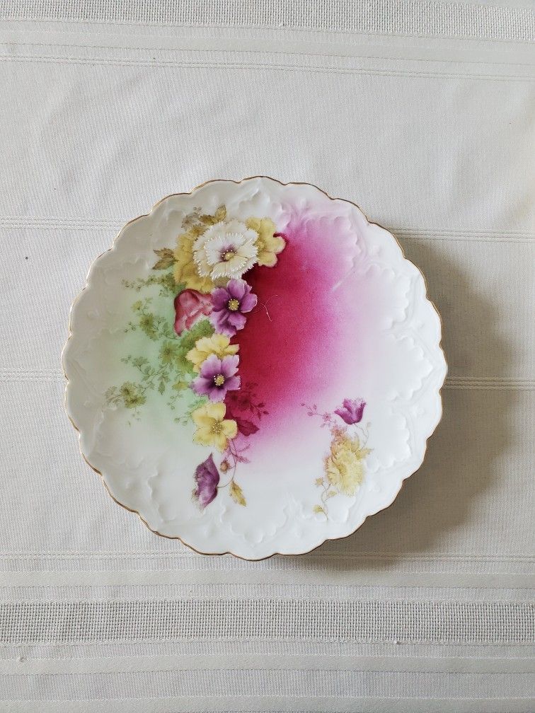8 1/2 inches across this plate has beautiful painting. From a distance what might like like a scratch is actually part of the flower. Gold trim makes it special along with the formed pattern around white edges in the china. From about 1940's. No chips or cracks.