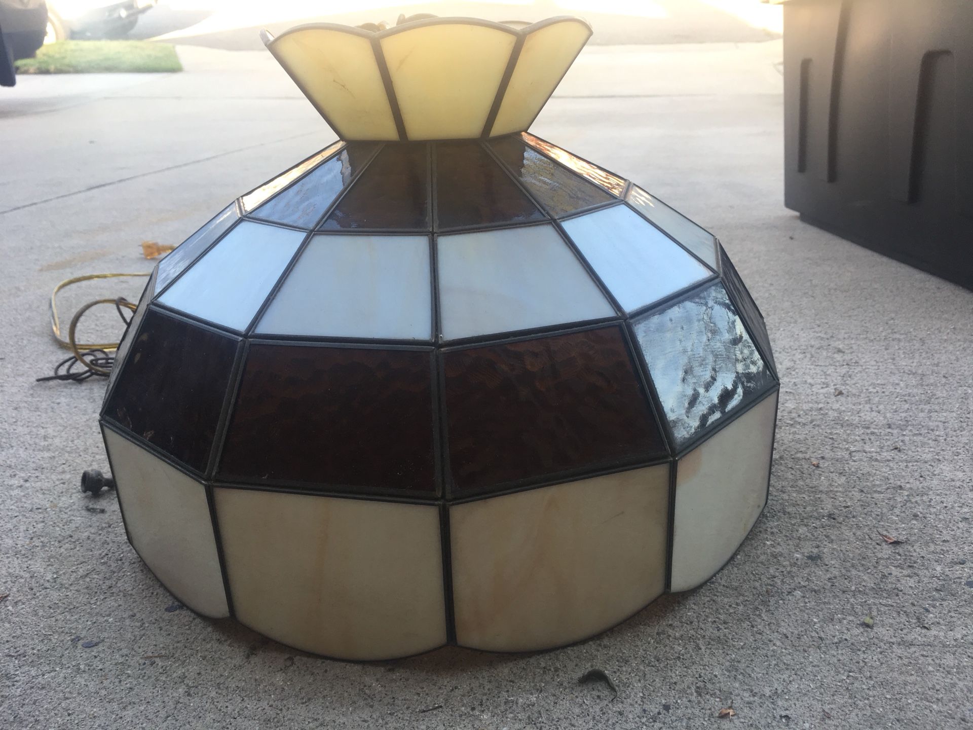 Vintage glass hanging lamp Great above a bar or pool table It works and has a on/off switch Also has a hanging chain $75obo