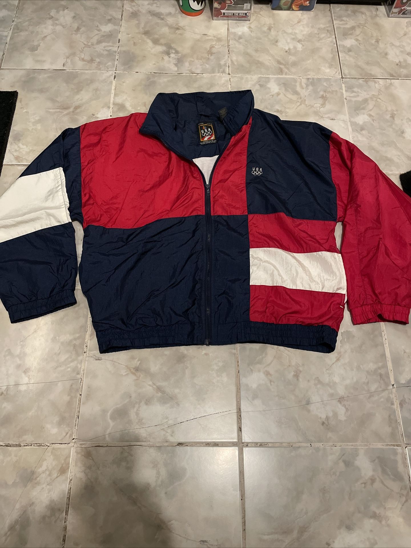 VINTAGE JC Penney Jacket Mens L Blue Red Full Zip Windbreaker USA Olympics 90s