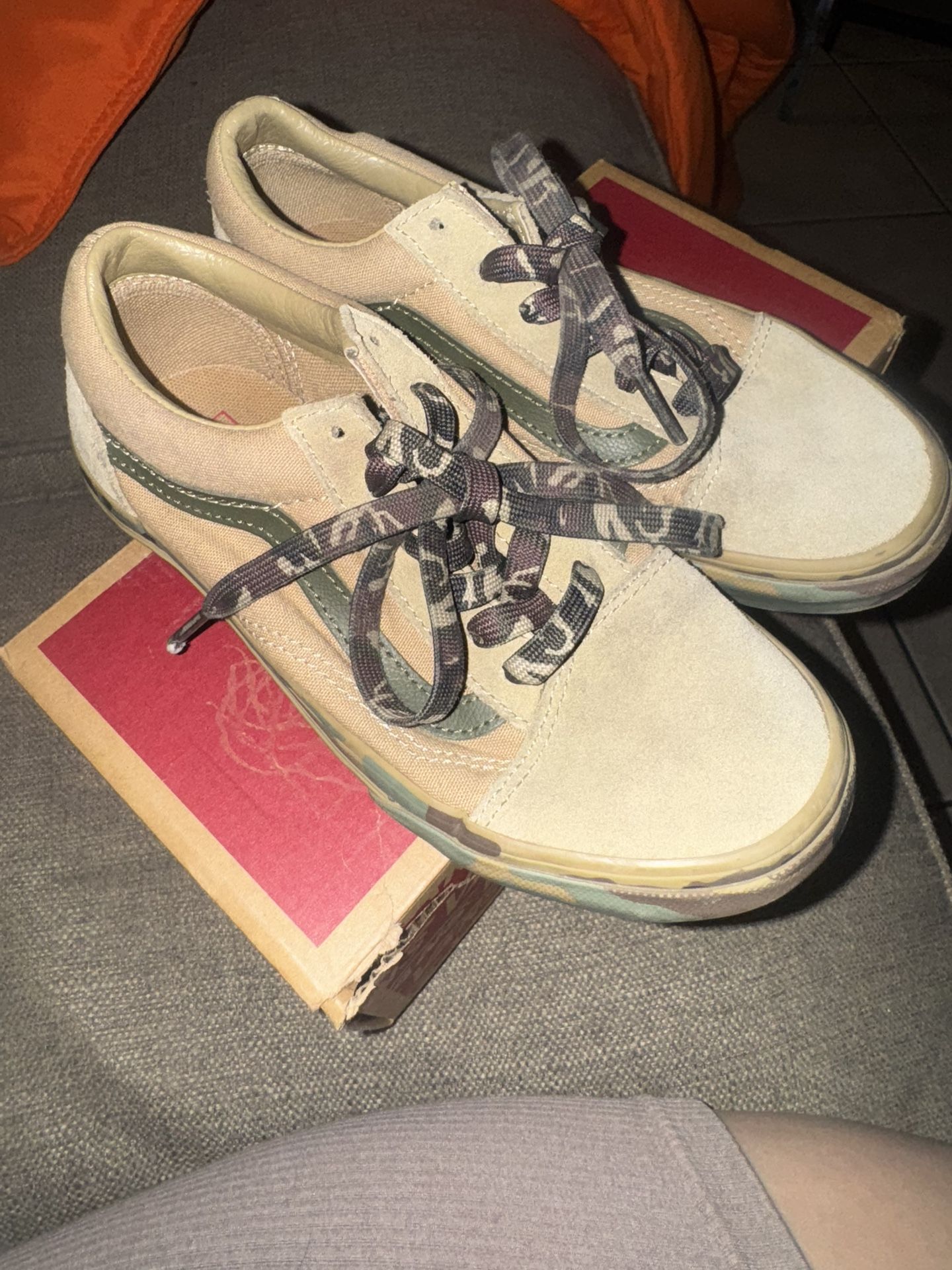 2.5 Y army camo on sole & laces and tan suede- classic lace fit Vans for kids. Lightly used still in great condition