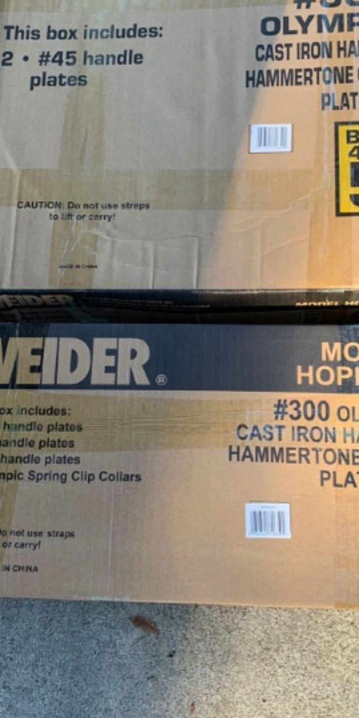 All brand new! 2x45 2x35 2x25 2x10 4x5 2x2.5 7ft 45lb Olympic barbell 500.00 Curl bars available 90.00 Rubber Hex Dumbbells available 1.85 per lb