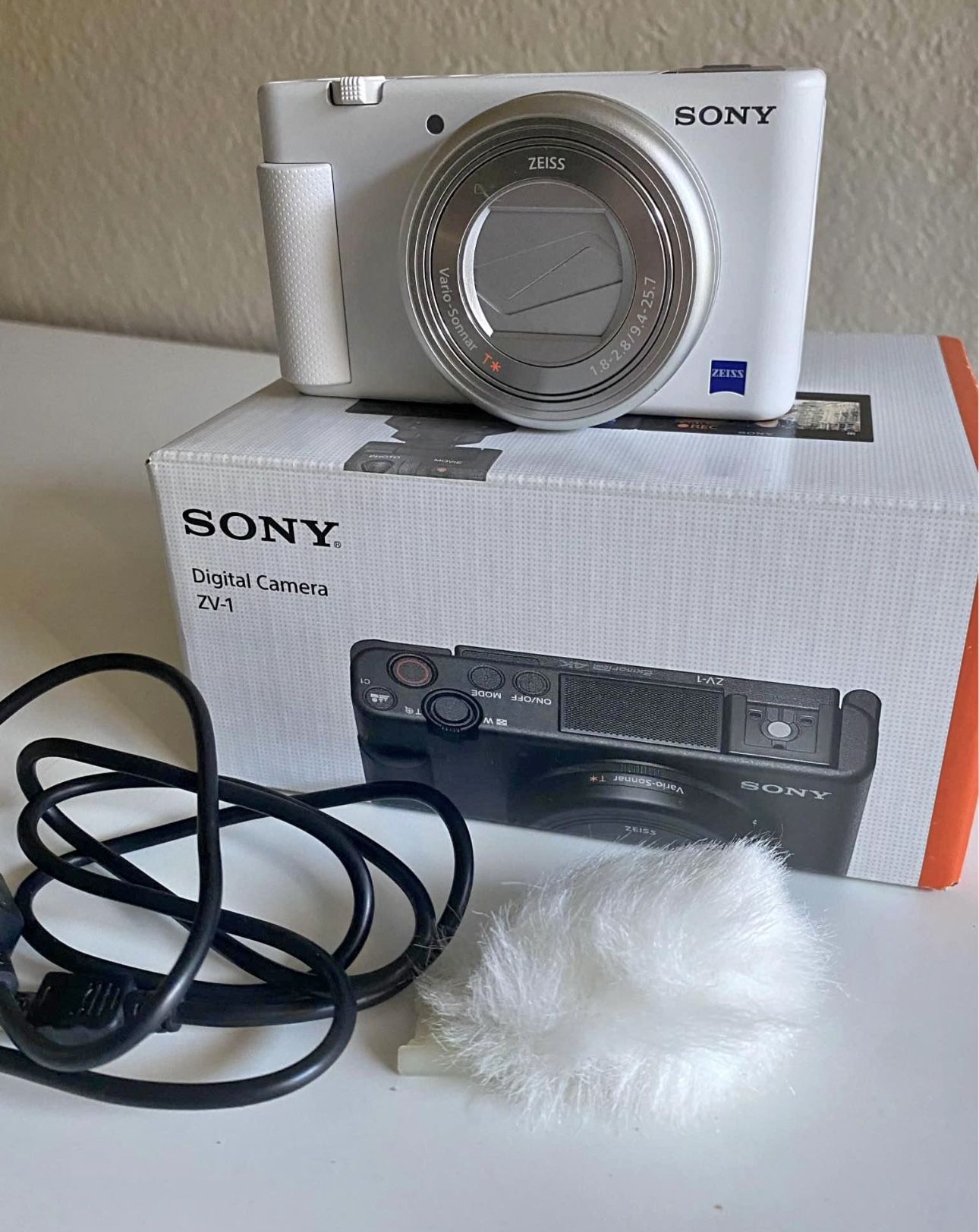 It’s a brand new ZV1 comes with a pink case and a strap and external flash too .