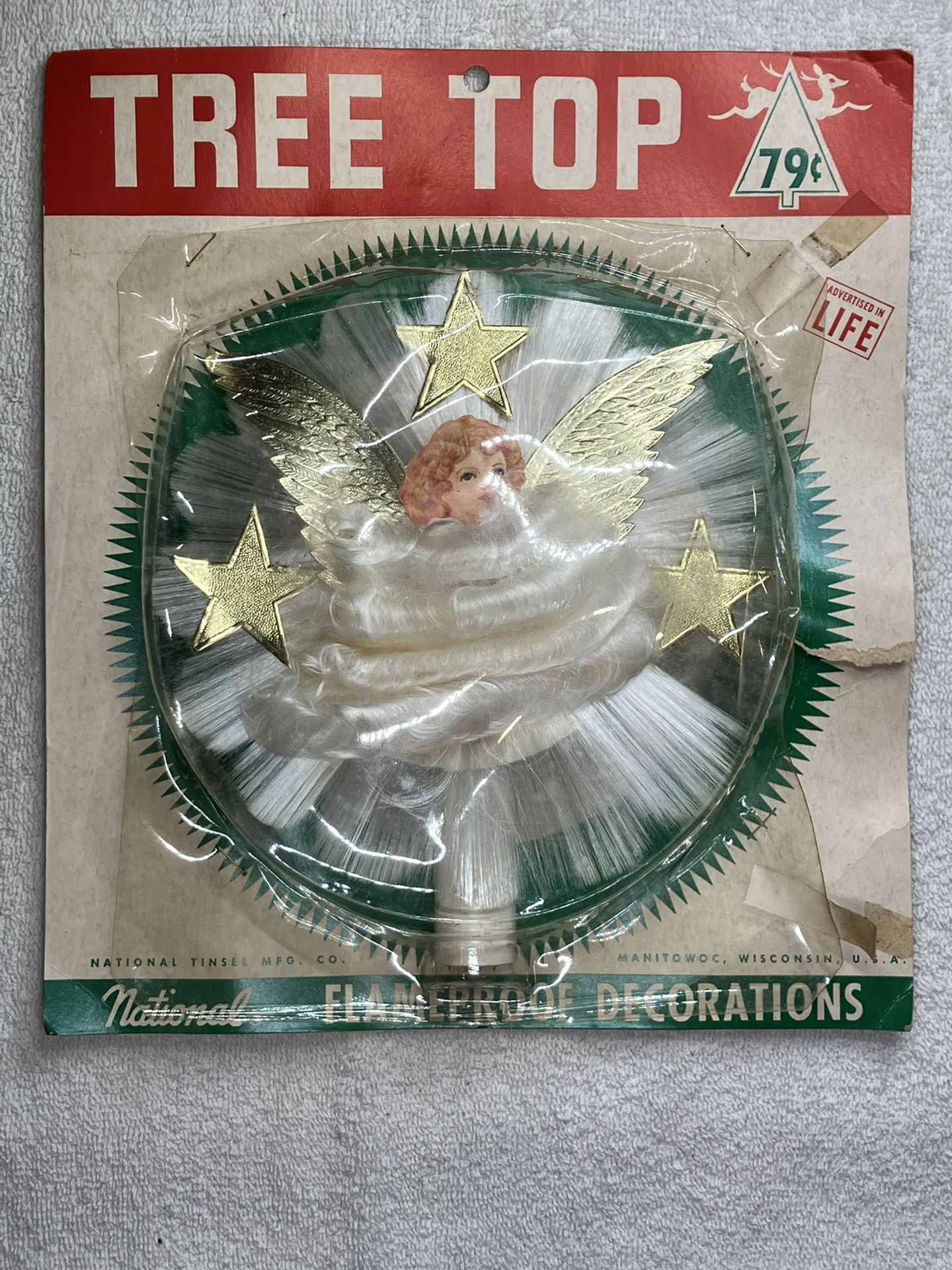 Vintage National Tinsel MFG Co angel Christmas tree topper with original packaging
