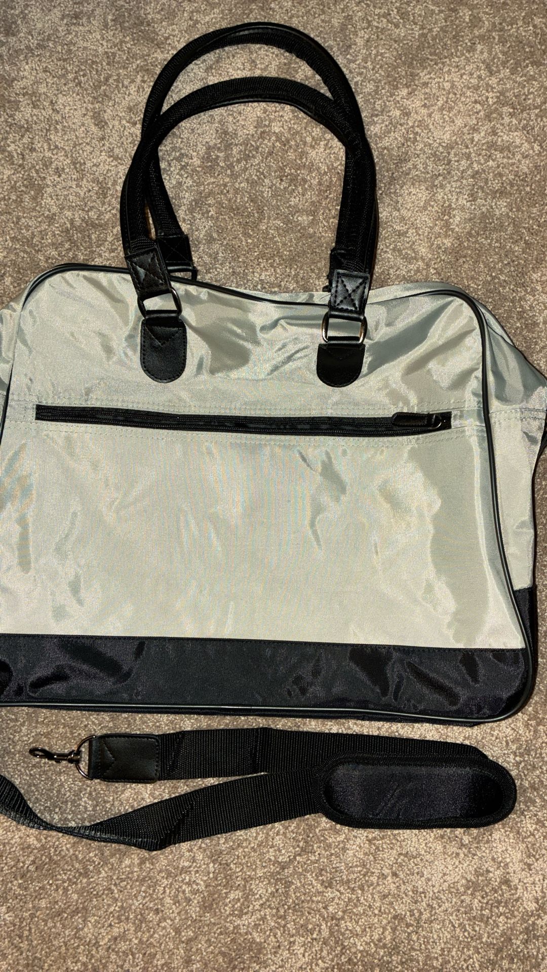 18”W x 6”D x 14 1/2” H;100 % nylon, (2) Zippers- closure, side pocket; w/ shoulder strap