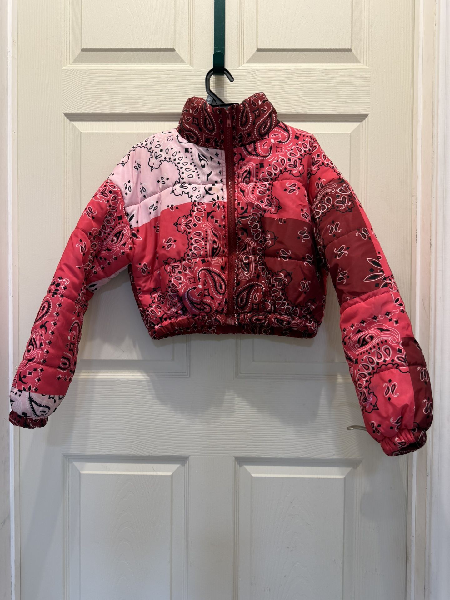Pink and red bandana print puffer jacket. There are a few pen stains on it. Size small. Must pick up. I only accept cash app.