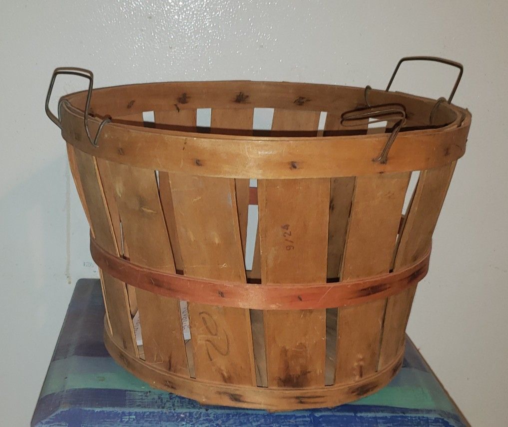 Large wood slated farm fruit basket. 14 in dia and 9.5 in tall