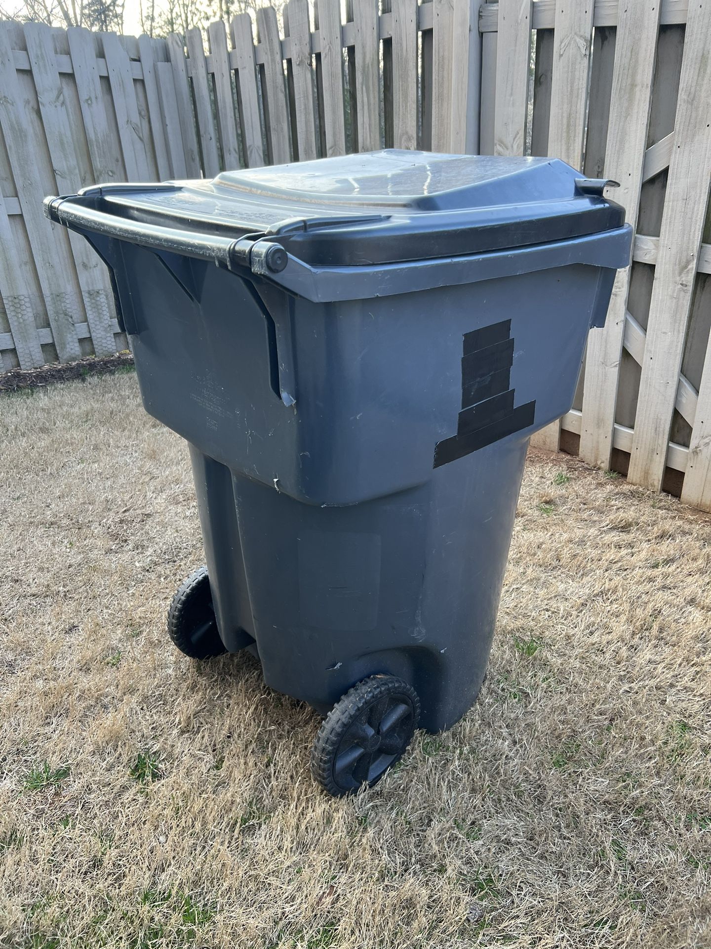 96 Gallon Heavy Duty Wheeled Trash Garbage Can With Lid Excellent condition No cracks or holes Pickup only Cash only Pickup location: 3715 E. North St. Greenville, SC 29615 next to the Goodwill Donation Trailer