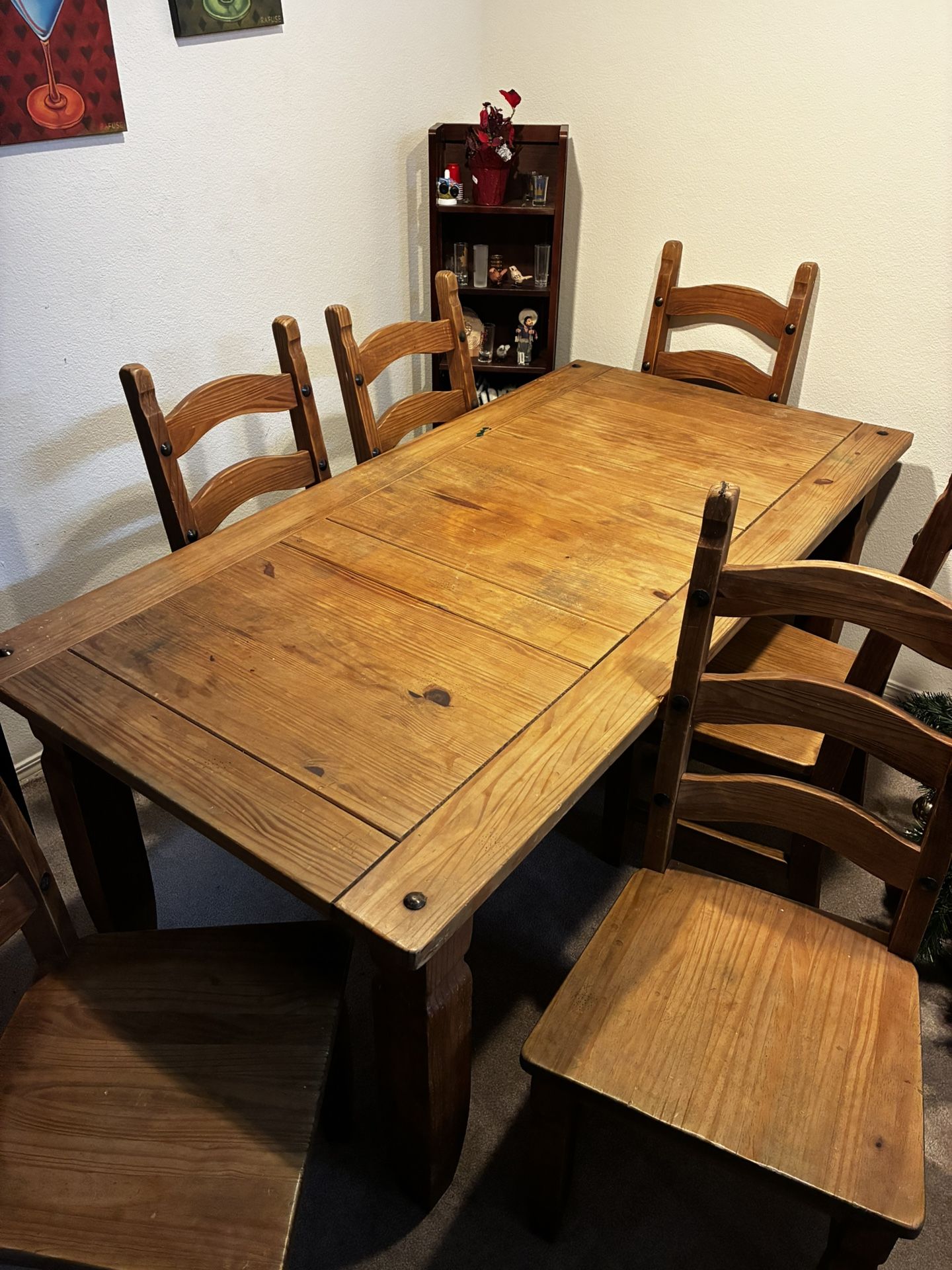This is a real solid wood dining set, not MDF or particle board. Very heavy and extremely sturdy — Table and chairs have been used for 5+ years and are still going strong. Seats a full family comfortably. Wood has a warm finish and classic style that fits most homes. Light cosmetic wear from normal use, nothing structural. If you’re looking for a table that will last another 10+ years, this is it. Selling as a set only. Pickup only.