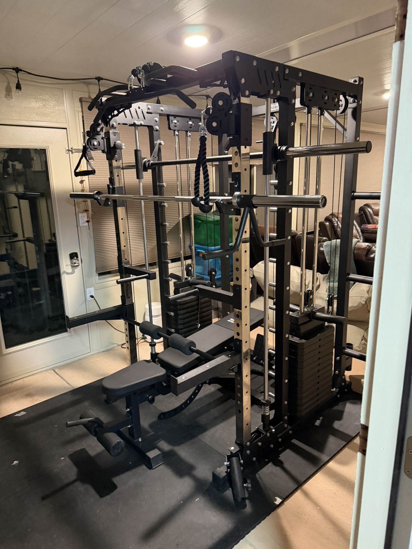 SM200 Smith Machine Bundlej Package 150lbs x 2 weight stacks (300lbsb weight stack total)❗️❗️❗️ N 👉290lbs Olympic Weights: Pair of each: 45 lbs,35 lbs, 25 lbs, 10 lbs, 5 lbs & 2.5 lbs + 45lbs 7Ft Olympic Bar Adjustable Bench From Decline all the way to upright . 👉660lbs Weight Rating Smith Machine + Functional Trainer Other Features: 👉Land Mine, Back Row Station , 4 Plate storage pegs. Attachments: Lat pull-down bar, straight bar, Tricep rope , Land Mine Dimensions: (Base) L 54”, W 49” H 86” With Smith Bar & Free Bar, Allow a total of 7ft total width space. Back of the machine: Allow + 8” in. Weight Plate Storage WARRANTY: LIMITED LIFETIME WARRANTY🔥🔥❗️❗️❗️❗️. Frame & Parts