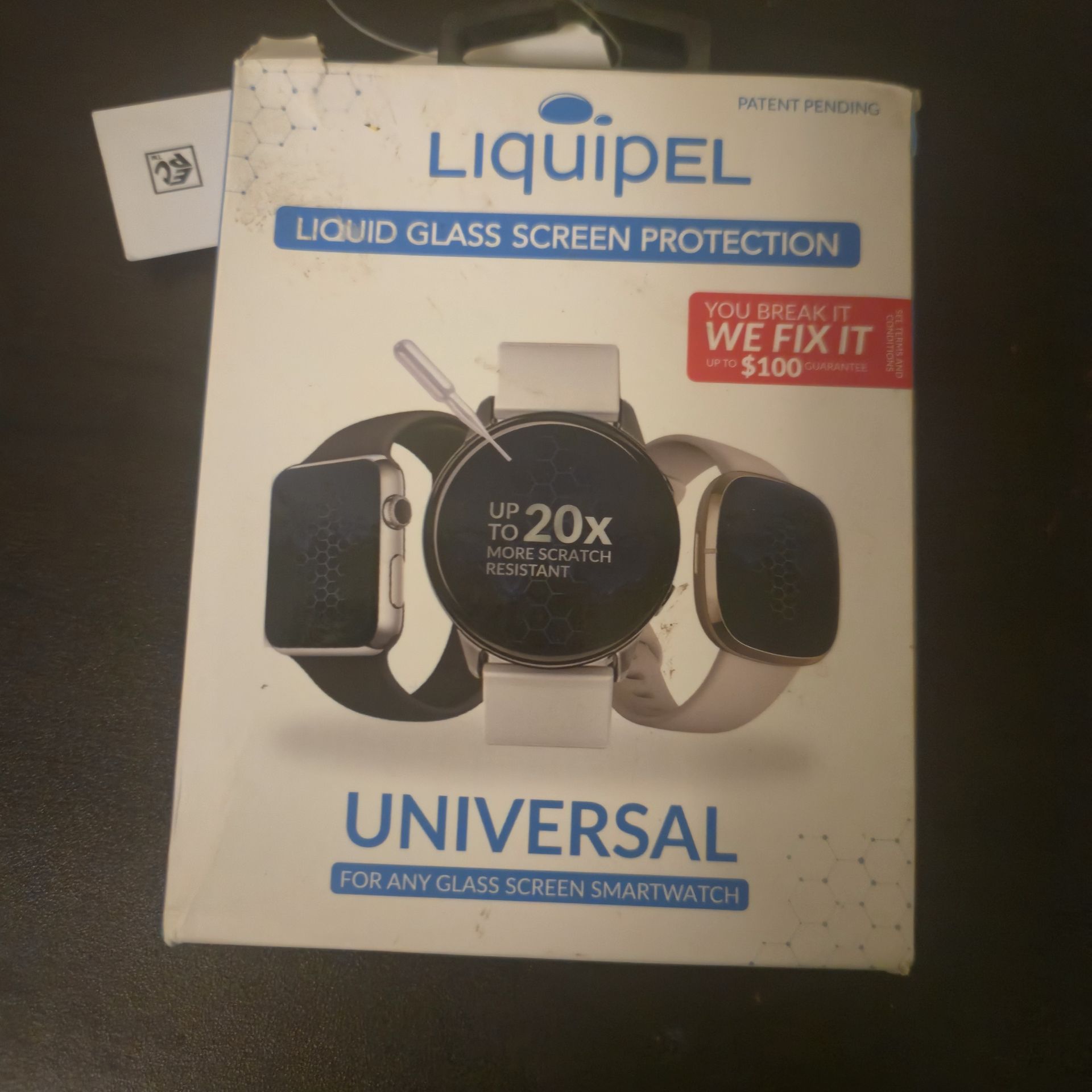 Liquipel Universal Liquid Glass Screen Protection for smartwatches. Designed for any glass screen smartwatch. Clear, invisible coating that bonds to the screen surface to help improve scratch resistance (advertised up to 20x more scratch resistant). Box shows light wear from storage, product appears new and unused. Suitable for most smartwatch glass displays.
