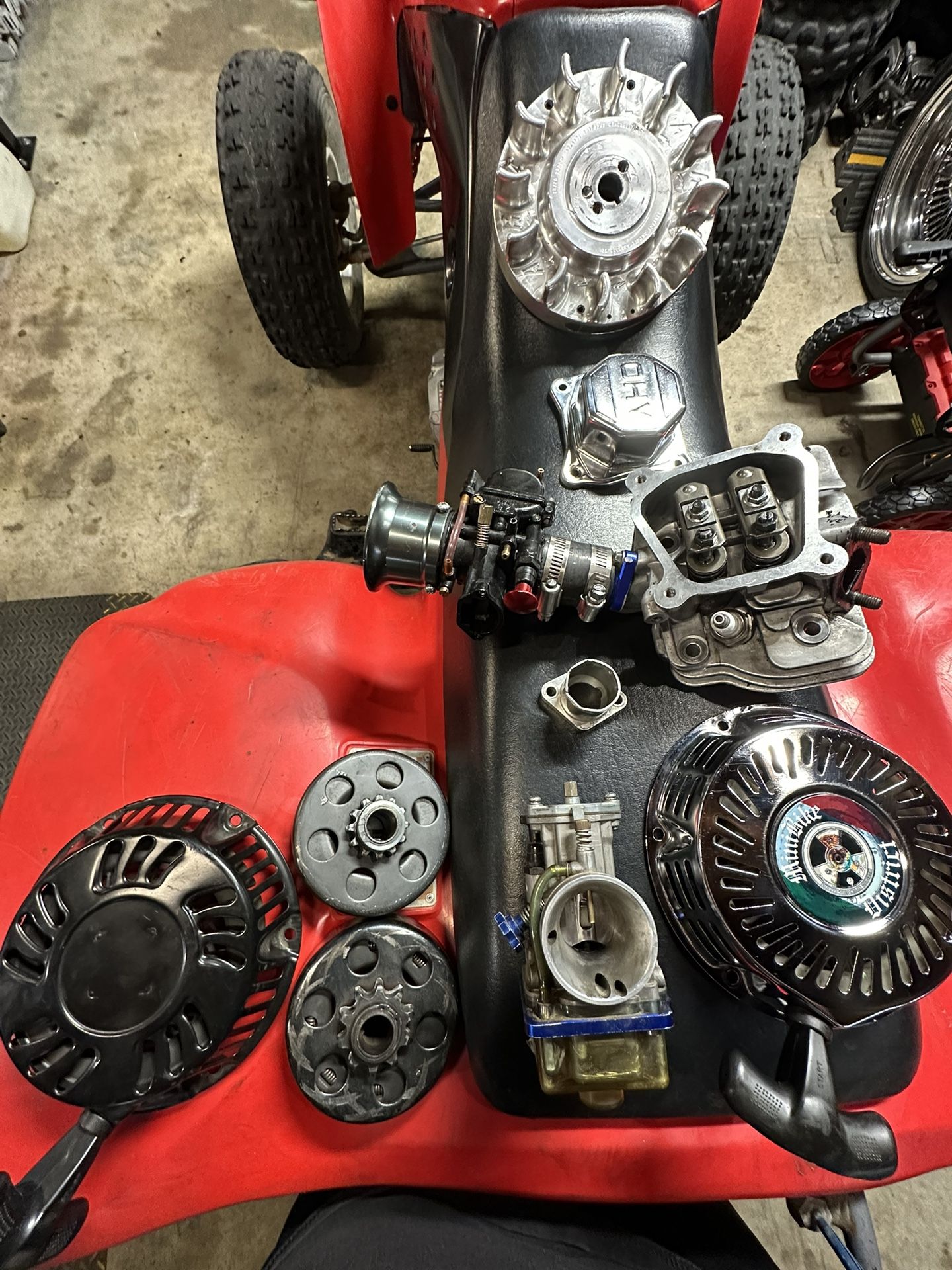 $25 chrome pulley $90 billet fly wheel non hemi 212 $75 stock head with 26lbs springs and og champion rockers with full Pwk 28 carb set up SOLD‼️ $30 clutches 40 and 35 chain $5 manifold SOLD‼️ $10 regular pulley SOLD‼️ $30 Pwk 28 each $10 valve cover Carb will not come with velocity stack Flywheel has no keyway damage