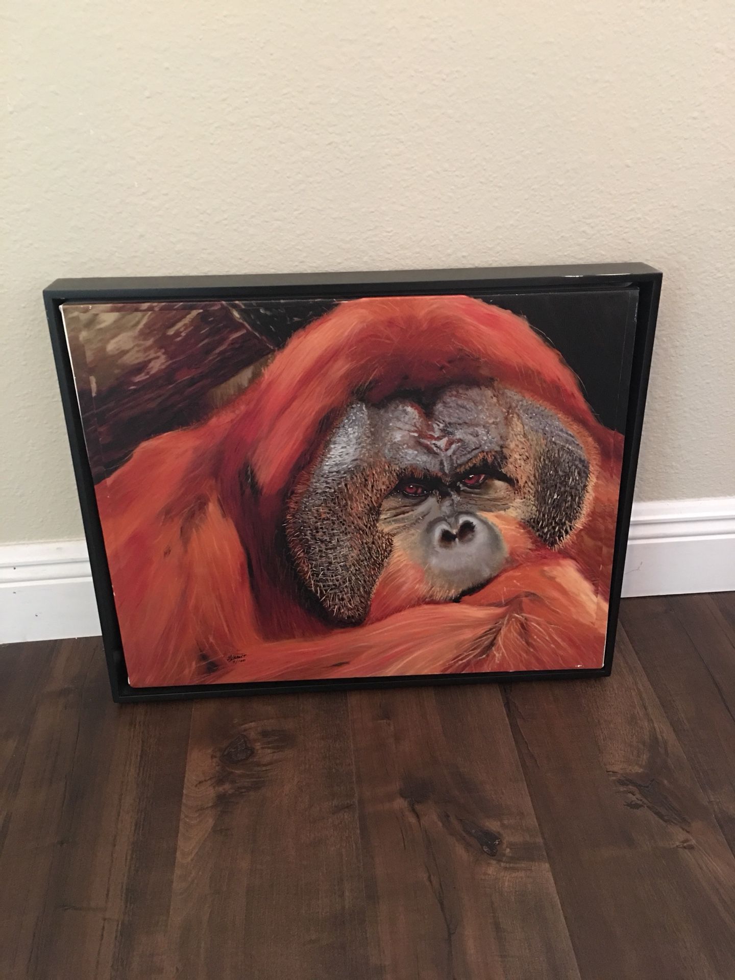 Custom orangutan framed canvas painting featuring Pongo from The Center for Great Apes in Florida. 21” x 17” inches including frame.