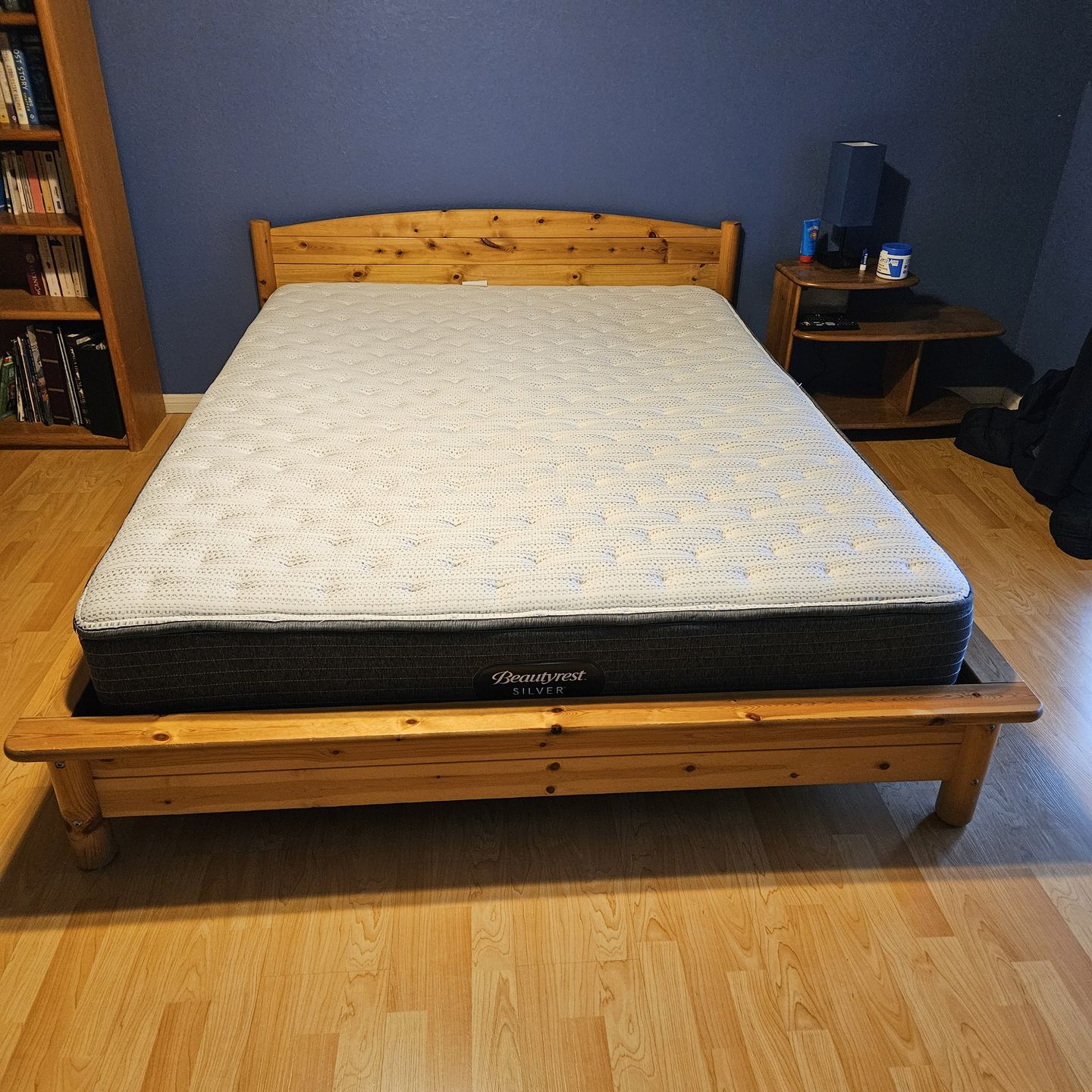 Excellent Condition Queen size bedframe ( pine wood) with extra-firm mattress ( Beautyrest)
