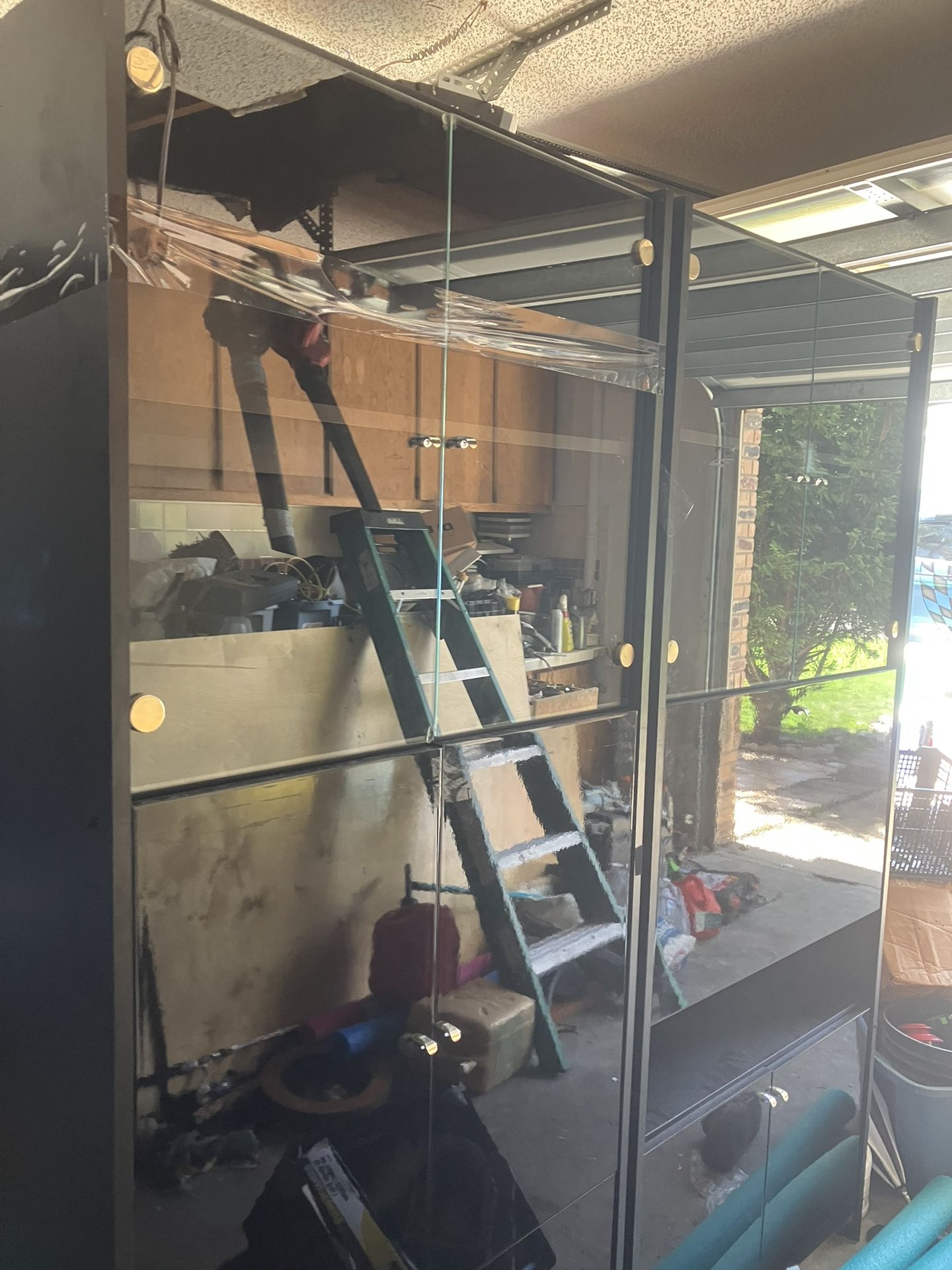 free black cabinets, with glass doors. small chips on the bottom from moving it, need it gone asap. CANNOT DELIVER.
