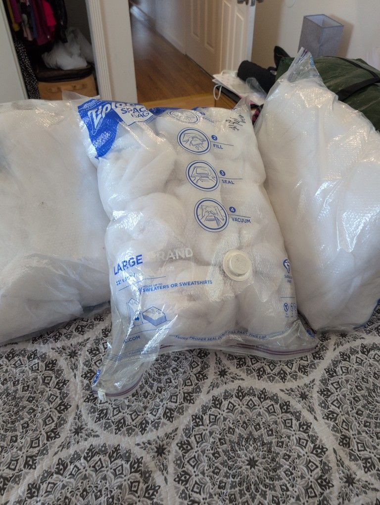 I have three vacuum sealed bags filled with pieces of tulle. They are different sizes. Most of it is white and there's one piece that was used as a long skirt.