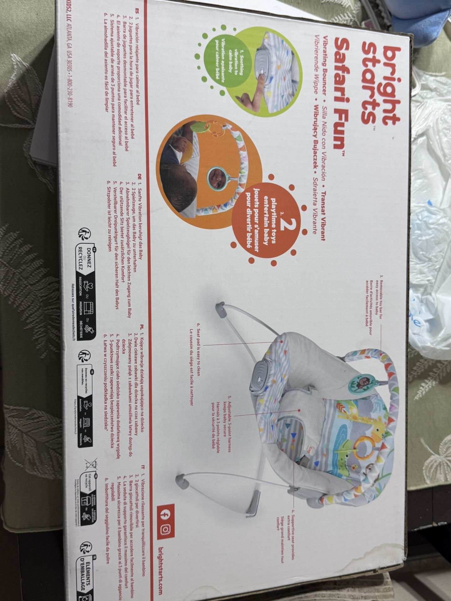 This is a brand new bright starts safari fund, vibrating bouncer. This has never been used brand new in the box $20 and it’s yours.