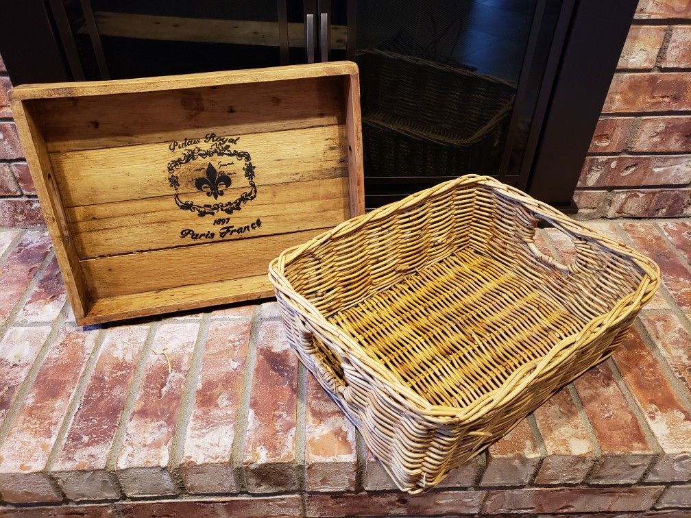 Light tan basket measures 17.75" X 14.25" X 6.25" tall. Light tan tray with Paris France emblem measures 18.25" X 13.5" X 2.75" tall. Both are in excellent condition and are from a smoke-free and pet-free home.